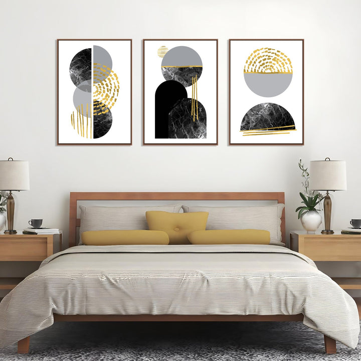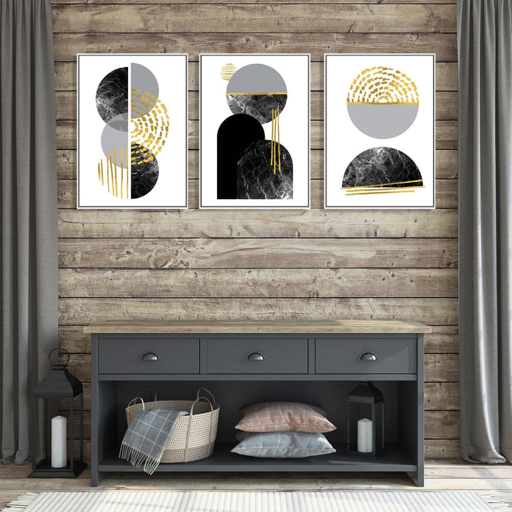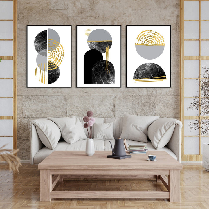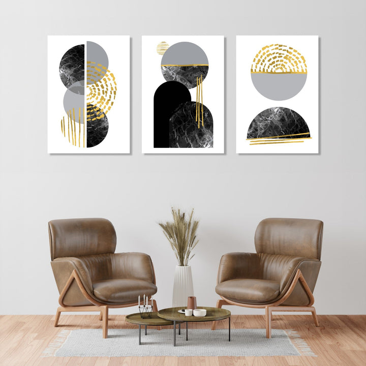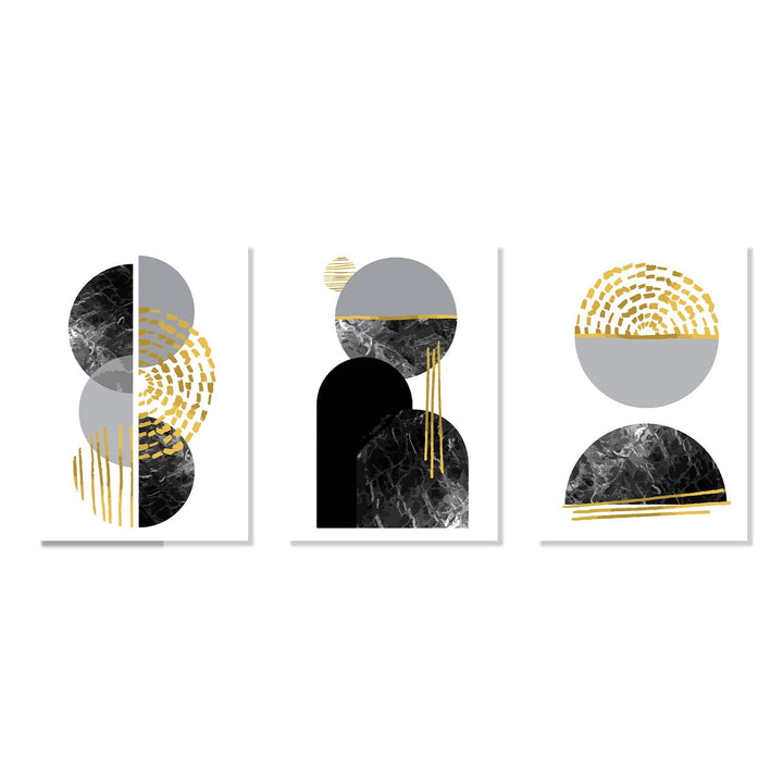 This set of three abstract paintings is a stunning display of fluid, organic shapes and lines. The color palette of black, white, gray, and gold creates a sophisticated and elegant look. Each panel features a unique composition of geometric shapes and textures that draw the viewer in. The left panel showcases overlapping circles with intricate textured patterns that add depth and dimension to the piece. The middle panel is dominated by an arch-like shape that sits atop a half-circle, with subtle gold streaks adding a touch of luxury to the composition. The right panel mirrors the left, with a single sphere resting atop a half-circle, sharing the same textured patterns and gold highlights. Overall, these paintings exude a sense of harmony and balance, with each panel complementing the others while still maintaining its own individuality. The intricate details and thoughtful composition make this set a truly captivating addition to any art collection.