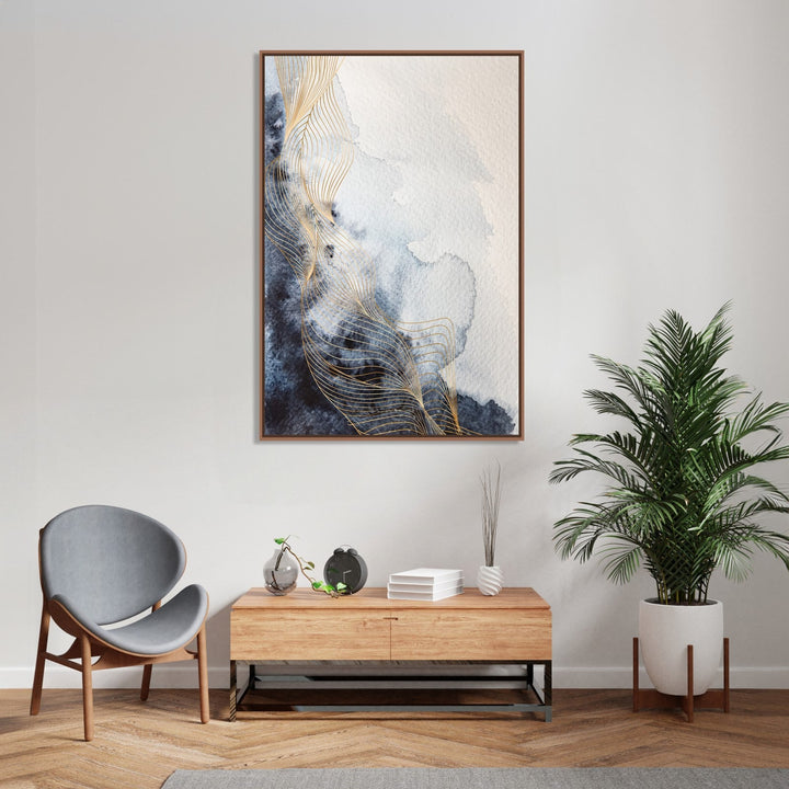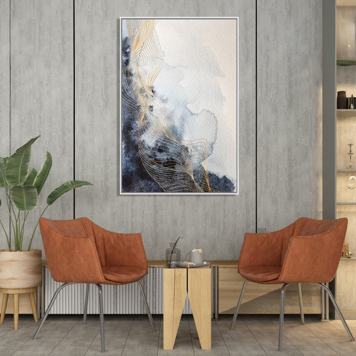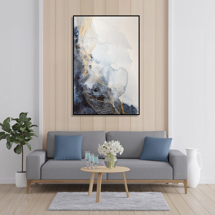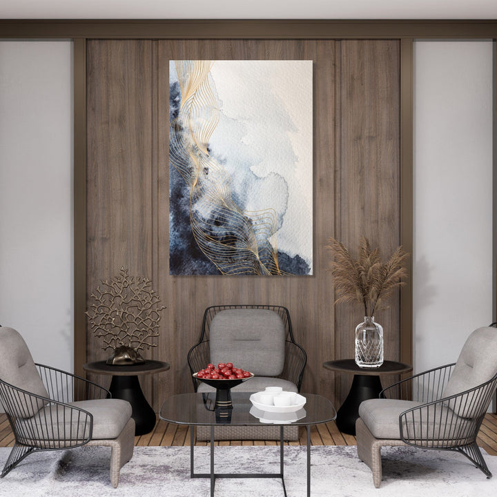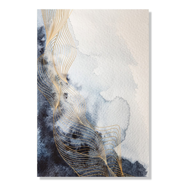 This handmade painting features stunning gold lines that shimmer against a crisp white background. The intricate ink painting detail showcases a beautiful blend of delicate golden strokes that create a mesmerizing abstract texture. The artist's attention to detail is evident in the precise and intricate design, making this piece a true work of art. The combination of the gold lines and white surface creates a striking contrast that draws the viewer in, while the delicate detailing adds depth and dimension to the overall composition. This painting is a unique and captivating piece that is sure to make a statement in any space.