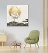 This painting features a serene and minimalist image of a white lotus flower, delicately placed against a backdrop of colors. The lotus is beautifully contrasted against a white, black, and golden background, creating a sense of harmony and balance. Behind the lotus, a golden orb adds a touch of radiance and mystique to the composition. The simplicity of the overall image allows the viewer to focus on the purity and elegance of the lotus, while the background adds depth and intrigue to the painting.