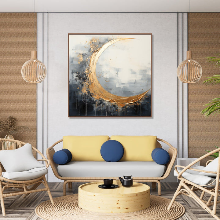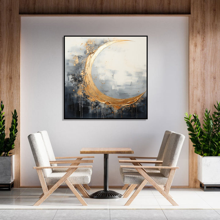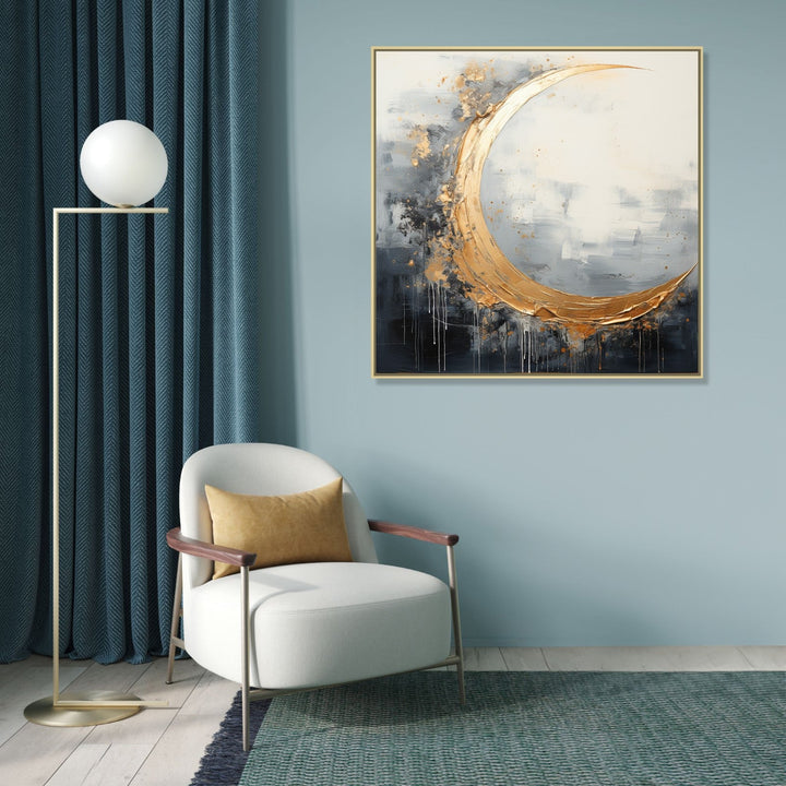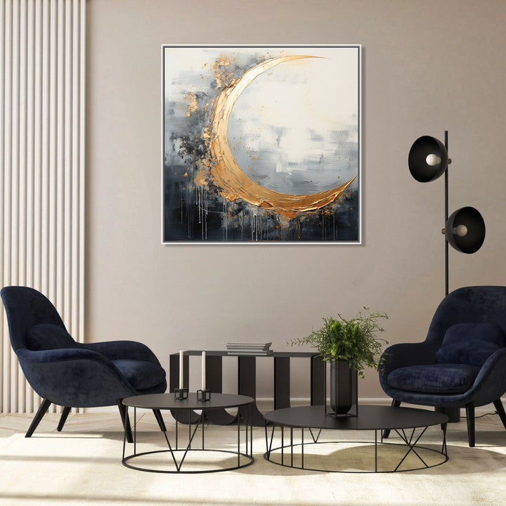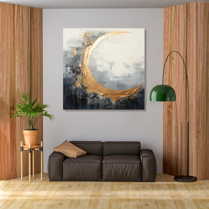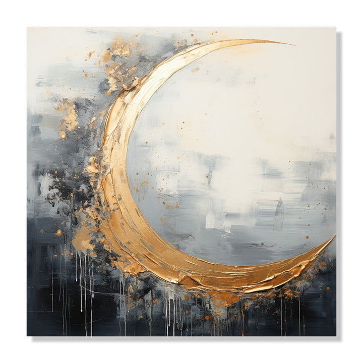 This painting is an abstract piece consisting of black, grey, and white colors. It features a prominent 3/4th moon shape in a stunning gold color. The overall composition is minimalistic and modern, with the moon shape serving as the focal point. The use of black, grey, and white creates a sense of depth and contrast, while the gold adds a touch of elegance and intrigue. This painting invites viewers to interpret its meaning and appreciate the harmonious blend of colors and shapes.