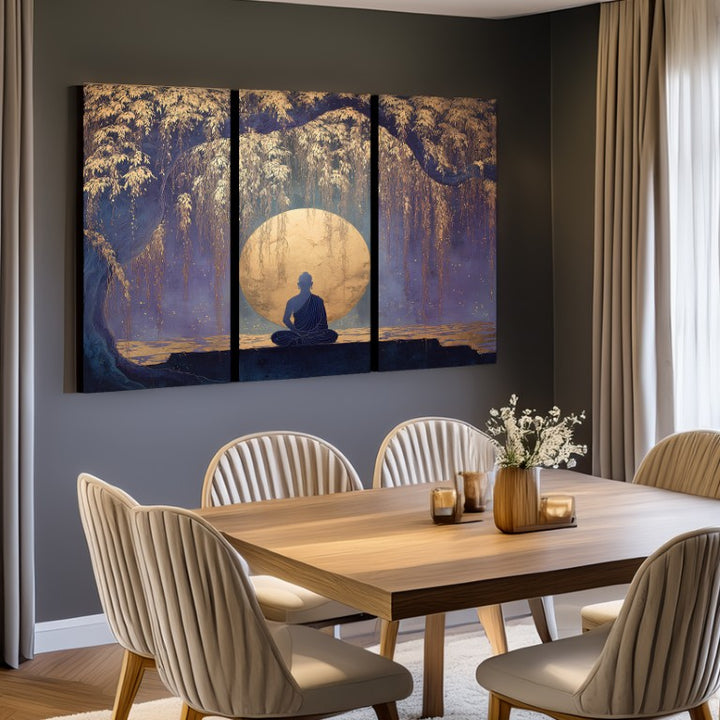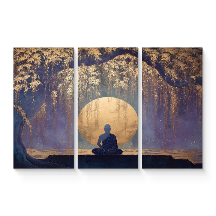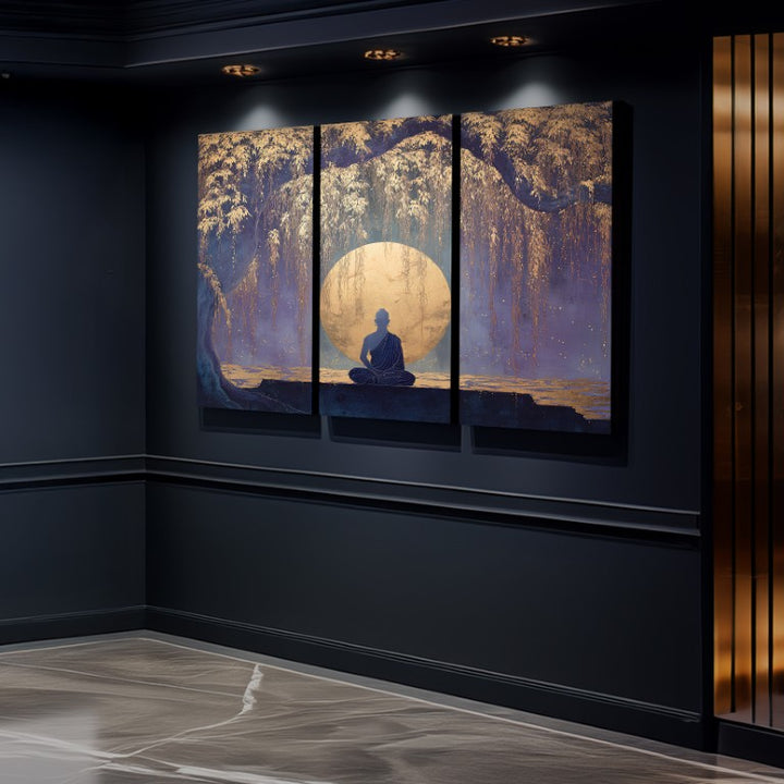 Elegant and luxurious, this Buddha meditation art features a golden moon and flowing gold tree silhouettes over a rich navy background. Ideal for upscale interiors or serene luxury spaces.