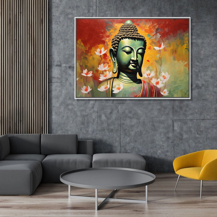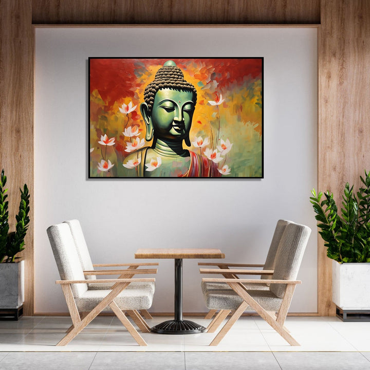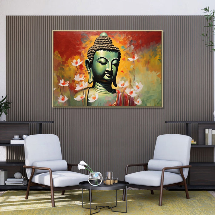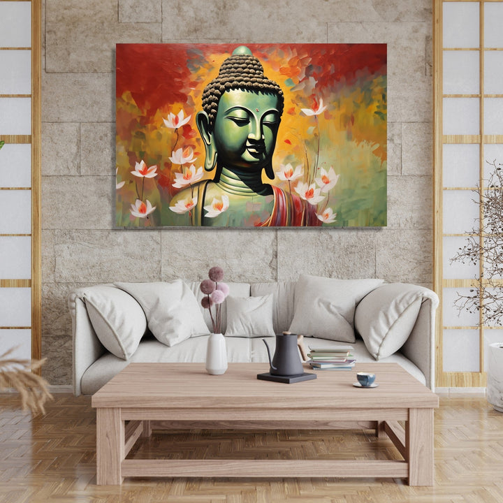 This captivating vastu painting depicts Buddha in a serene meditative pose. Its a rich Vastu theme where buddha symbolises peace and prosperity , warm colors evoke a sense of energy and passion, while the small lotus flowers scattered throughout the composition symbolize purity and enlightenment.í�í¬_