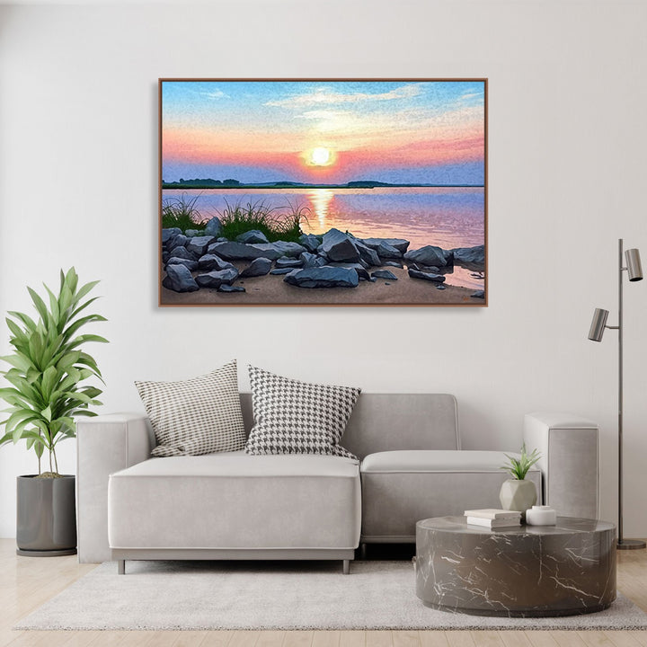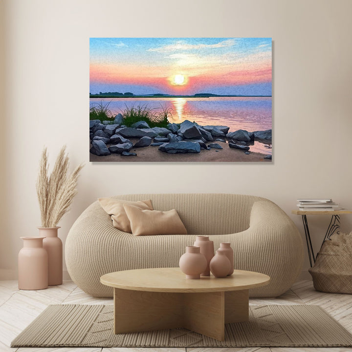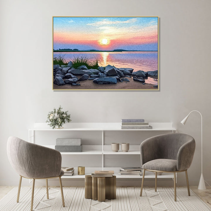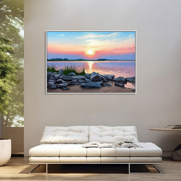 'Golden Reflections' captures the serene beauty of a sun setting over a tranquil lake, with the soft glow of the golden hour casting a warm reflection on the calm waters. The stones along the shore add a touch of ruggedness to the otherwise peaceful scene.