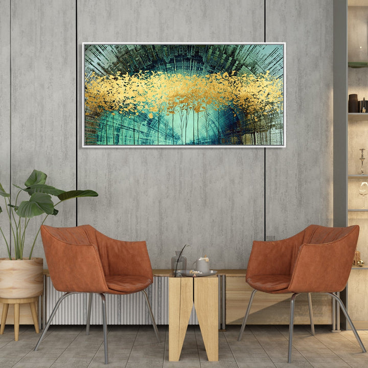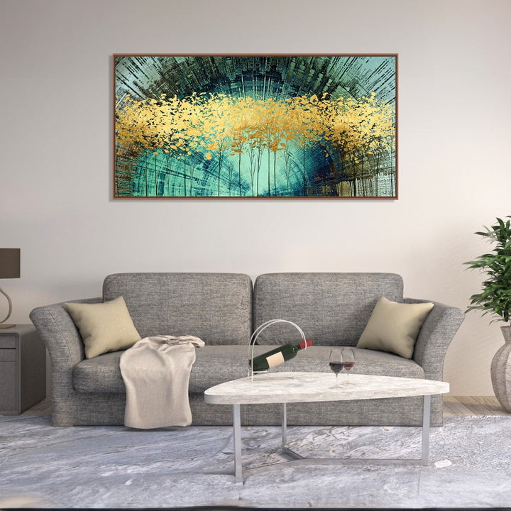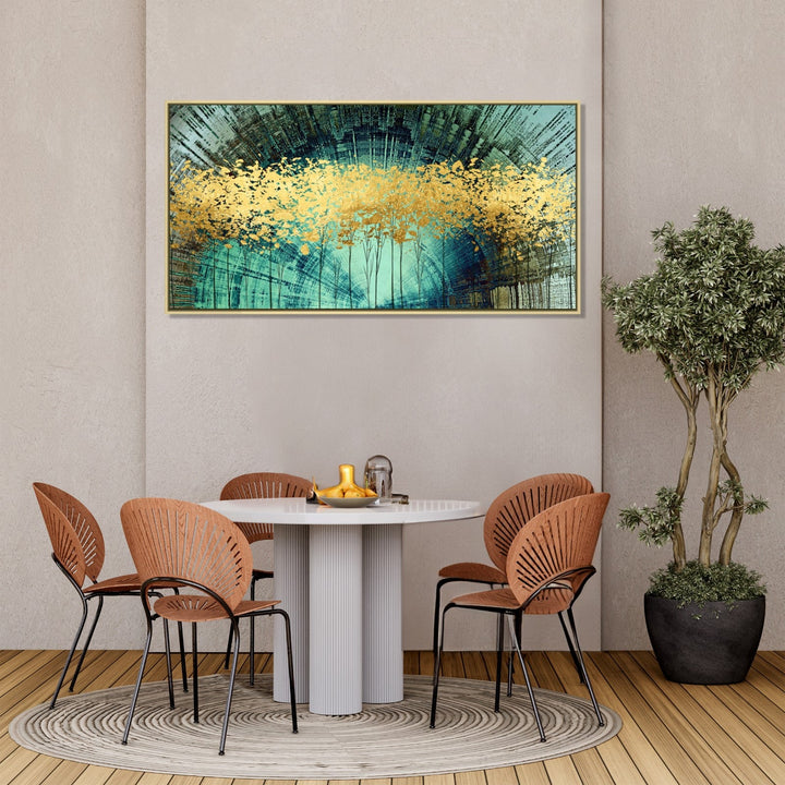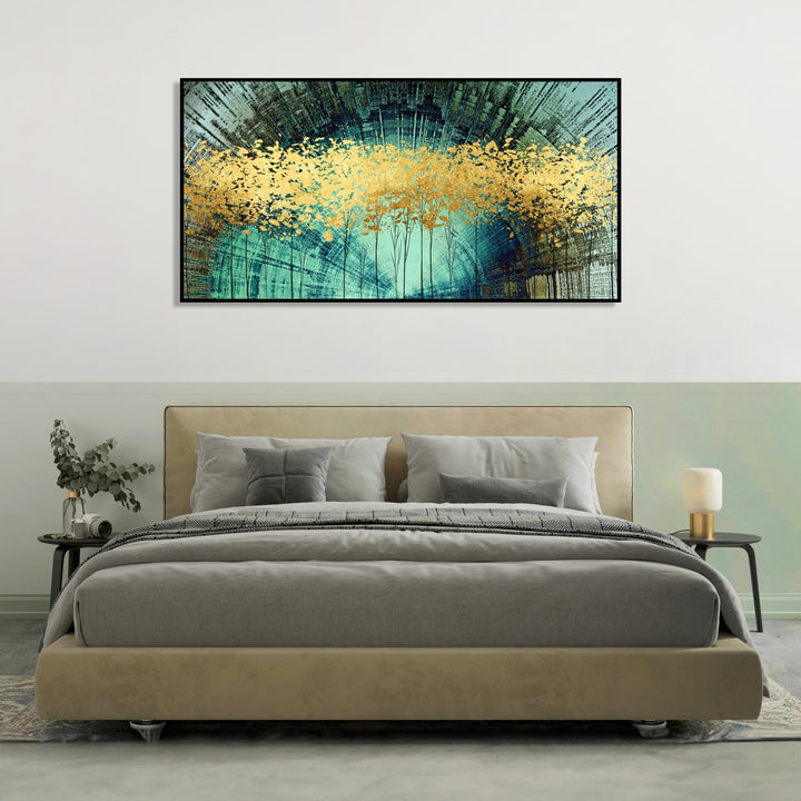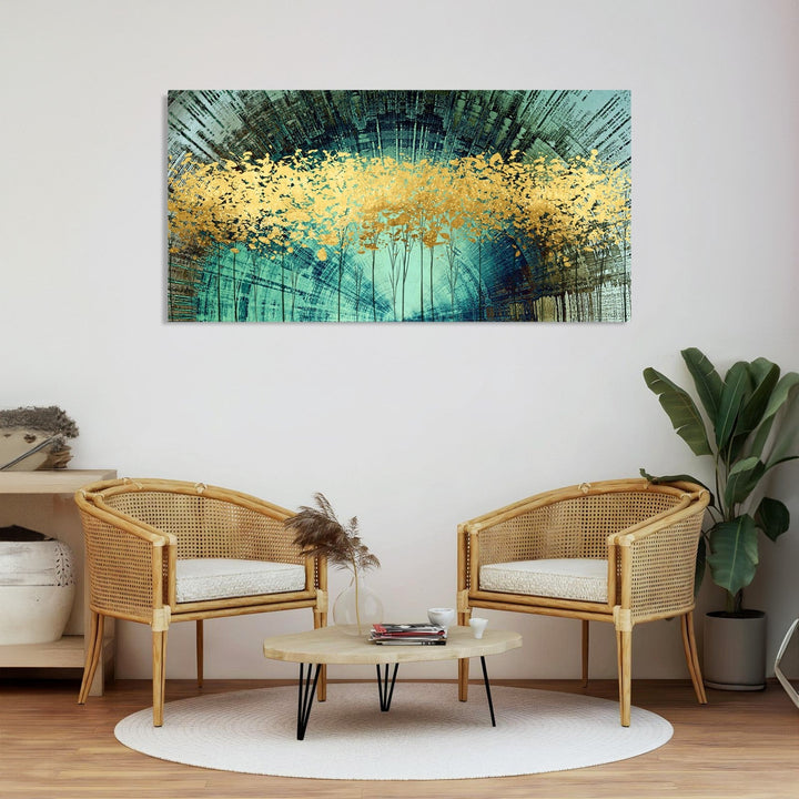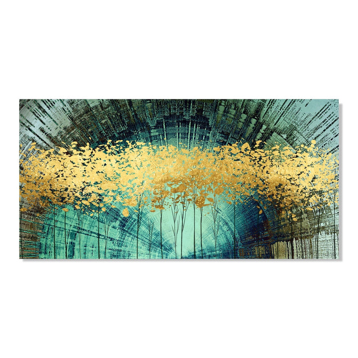 This handmade painting captures a stunning scene of nature with a burst of vibrant yellow and gold foliage at the center, symbolizing the beauty of trees or plants in full bloom. The background showcases a dome-like structure or sky above, depicted with textured strokes in shades of blue, green, and black, adding depth and dimension to the composition. The contrast between the warm, earthy tones of the foliage and the cool, calming hues of the sky creates a harmonious balance in the artwork. The intricate details and careful brushwork bring the scene to life, inviting the viewer to immerse themselves in the tranquil and serene atmosphere of the painting.