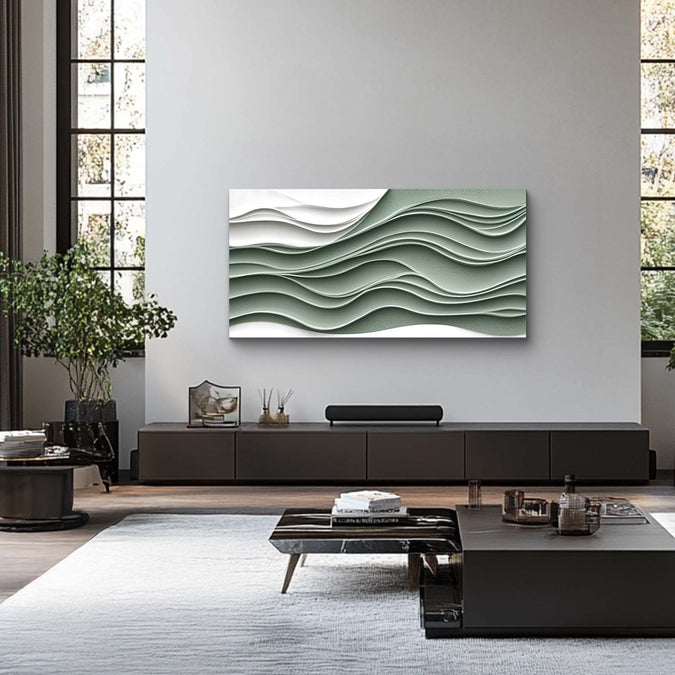 In Green and White Layered Wave artpiece, layered forms rise and fall in green and white, balancing the serenity of white with the fresh clarity of green. The waves are not loud, but they have persistence, like thoughts gathering strength, like impulses taking shape and becoming purposeful. This piece asks the viewer to stay with those quieter moments of internal momentum and to revel in how they generate new horizons.