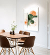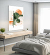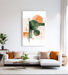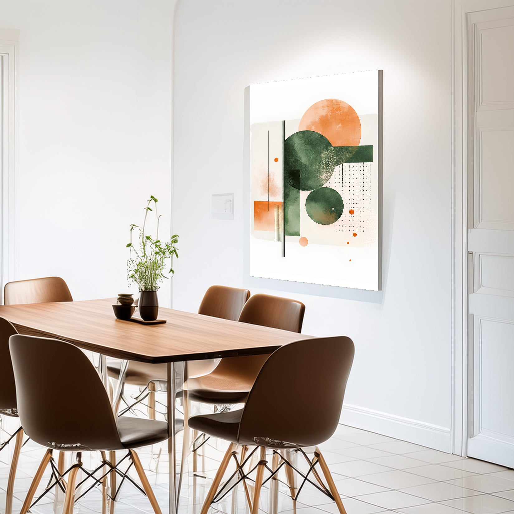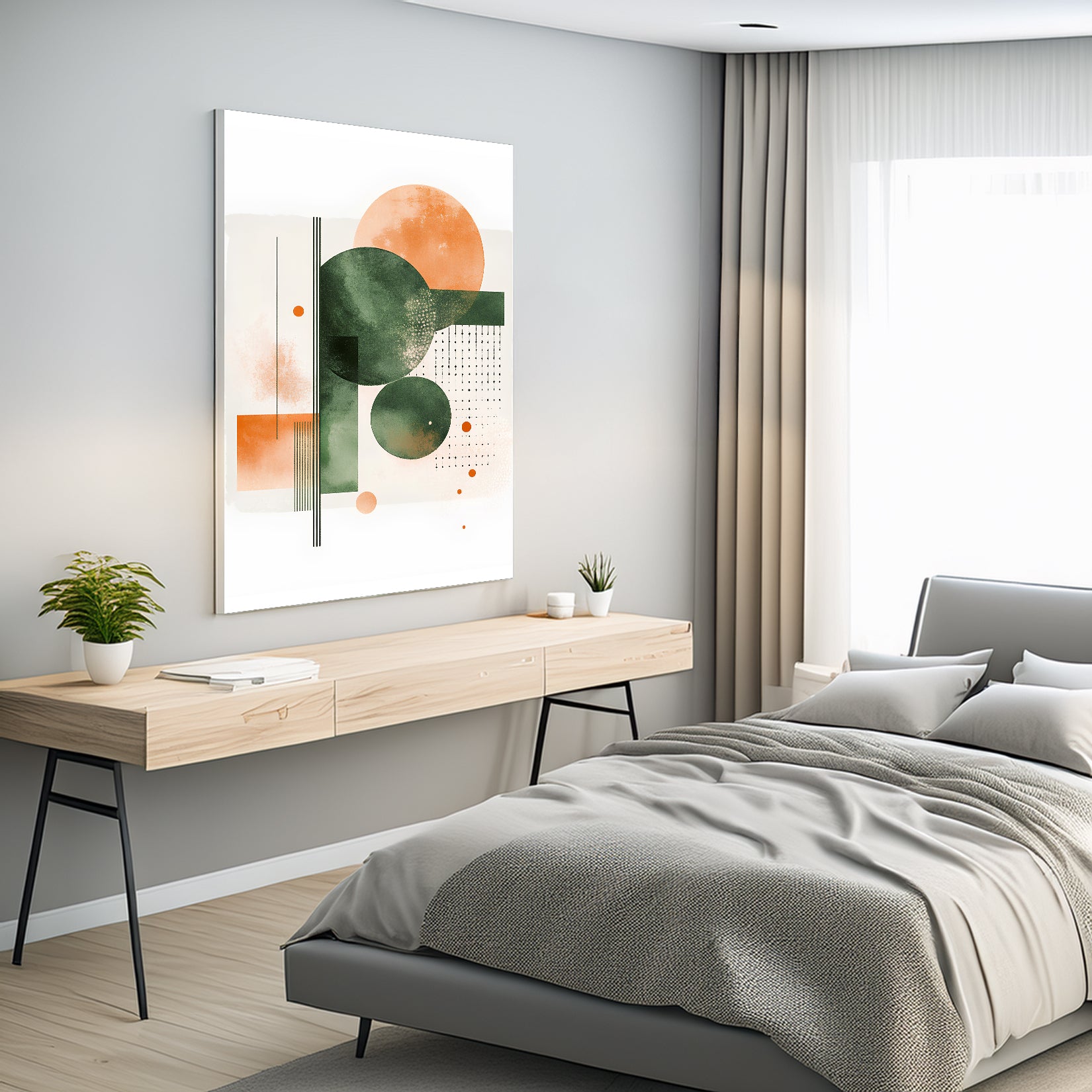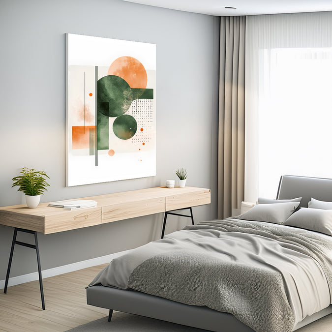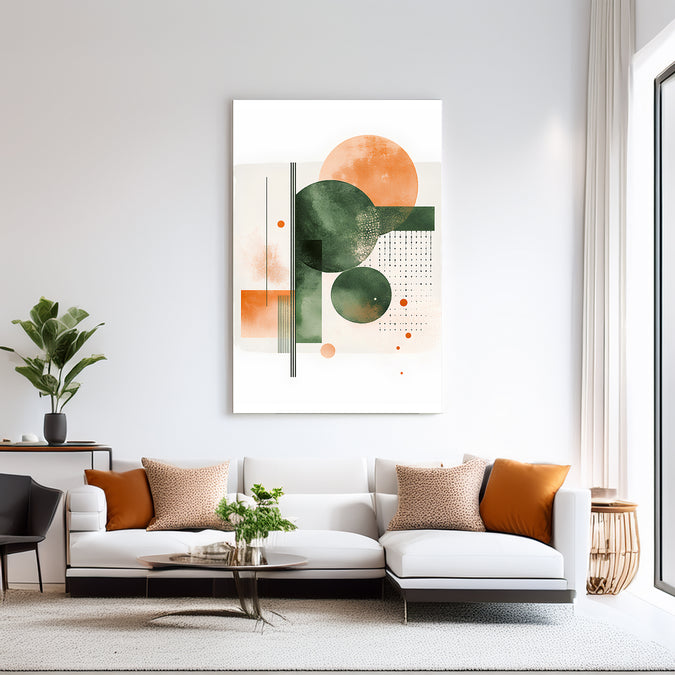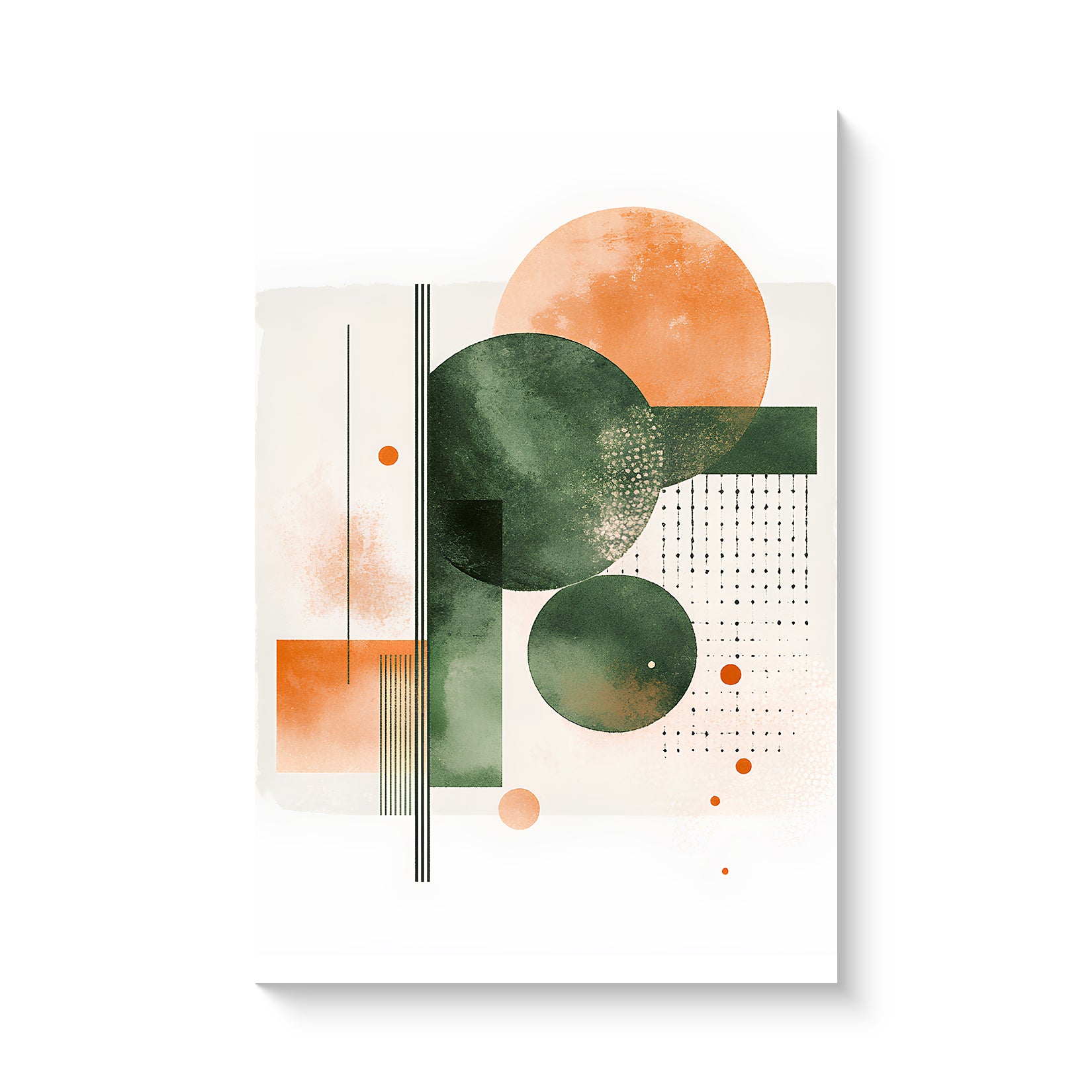 A harmonious abstract artwork combining soft circles and straight lines in green and orange, creating visual symmetry and calm.