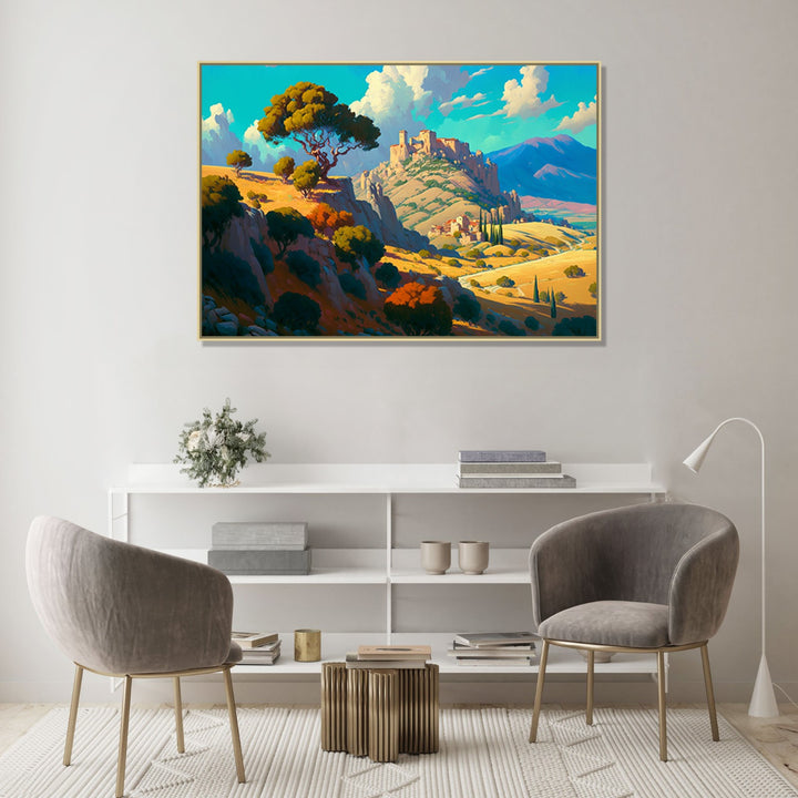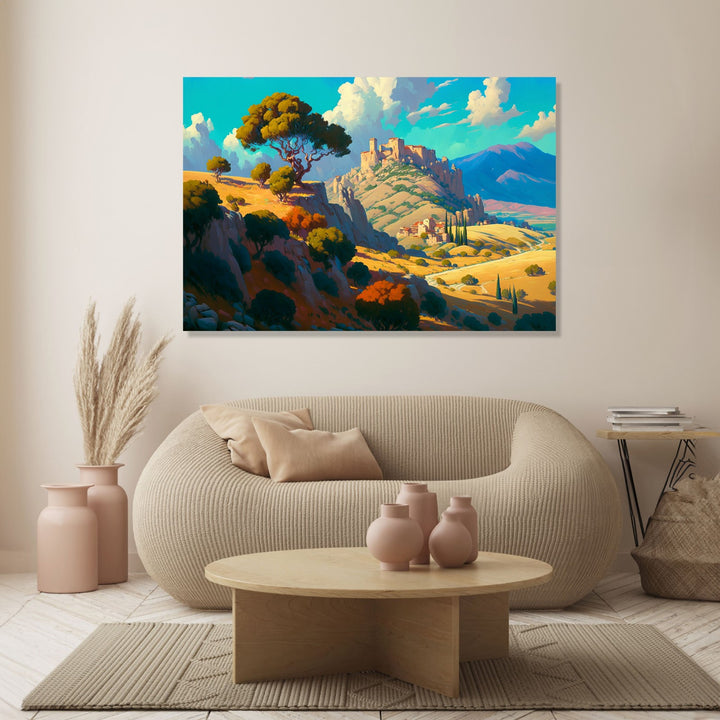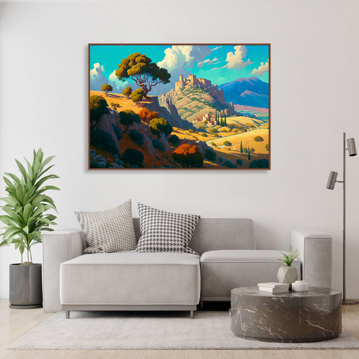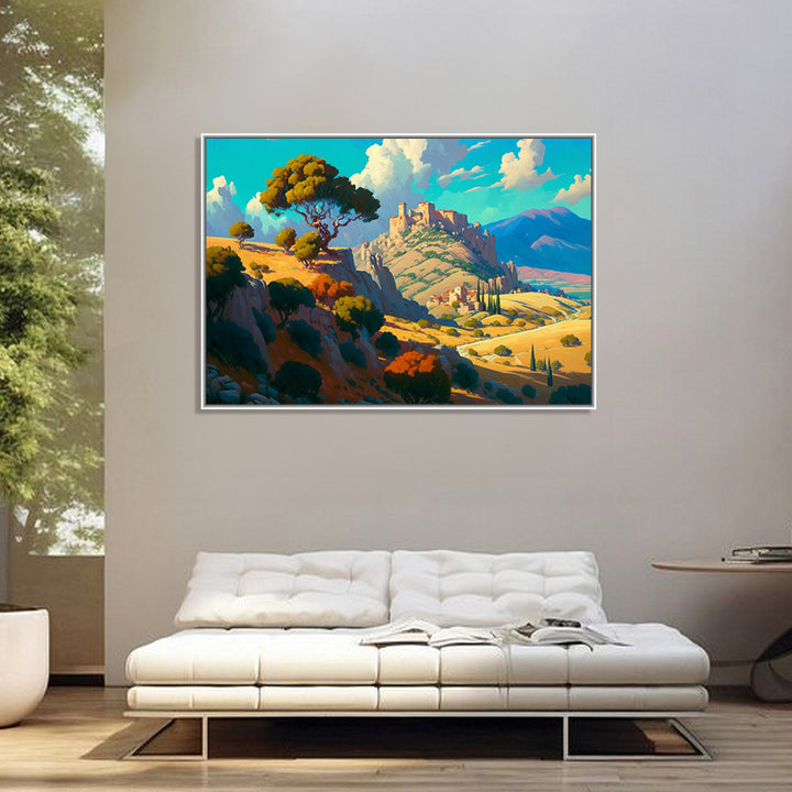'Guardians of the Horizon' captures the breathtaking beauty of nature's guardians. A majestic tree stands proudly on a cliff in the foreground, while a fortified hilltop fort watches over the land. Beyond, the misty grey mountains create a stunning backdrop, evoking a sense of awe and wonder.