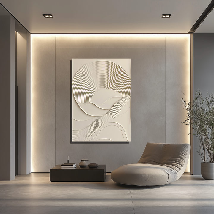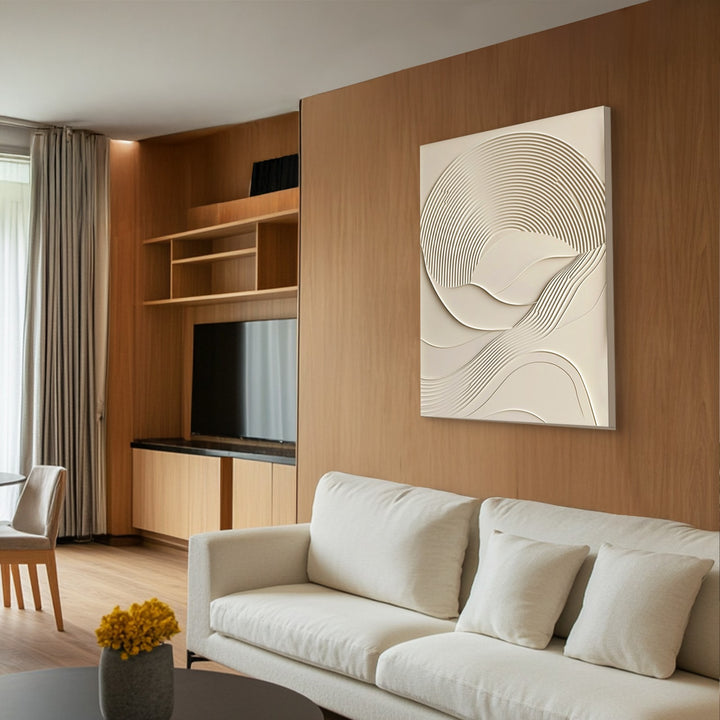 This handcrafted 3D wall Decor features a mesmerizing blend of organic waves and concentric curves, evoking a sense of movement and balance. The delicate texture enhances depth and shadow play, making it an elegant modern wall art choice for luxury homes, offices, and galleries