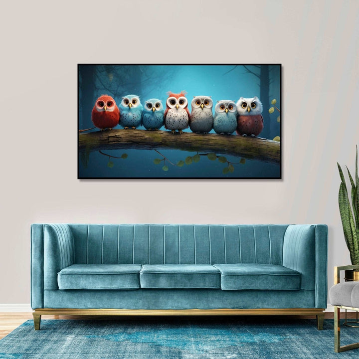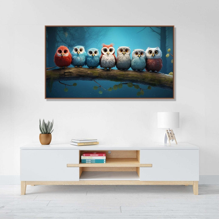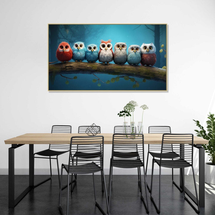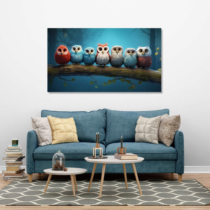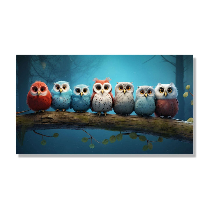 "Hooters in Wonderland" enchants with seven colorful small owls perched on a branch, set against a blue dreamscape background. The whimsical composition captures the playful spirit of these charming feathered creatures.