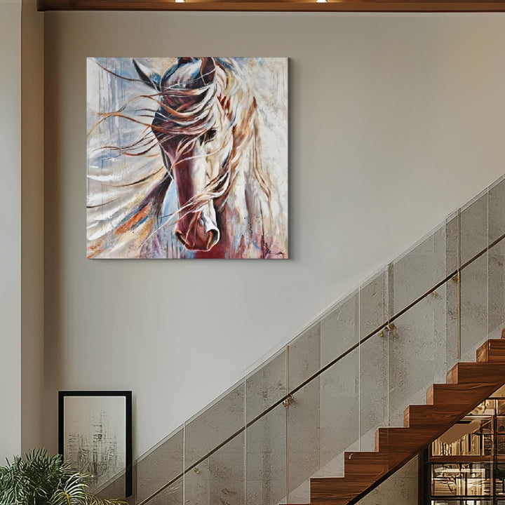 'Majestic Equine Beauty' captures the grace and power of a horse in stunning detail, using soft pastel colours to bring the majestic creature to life on the canvas. Flying mane of the horse enhances beauty of this enigmatic creature and exudes class and elegance in soft pastels.