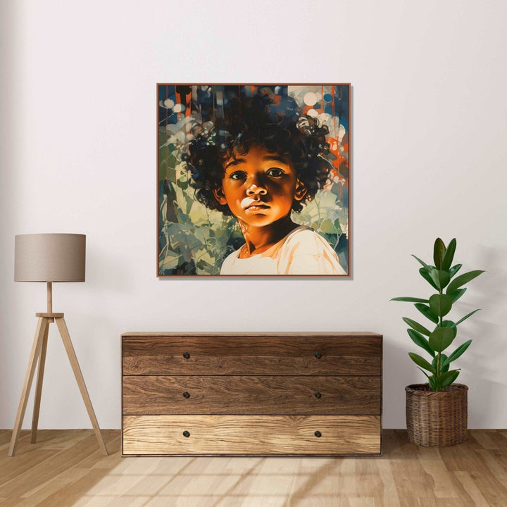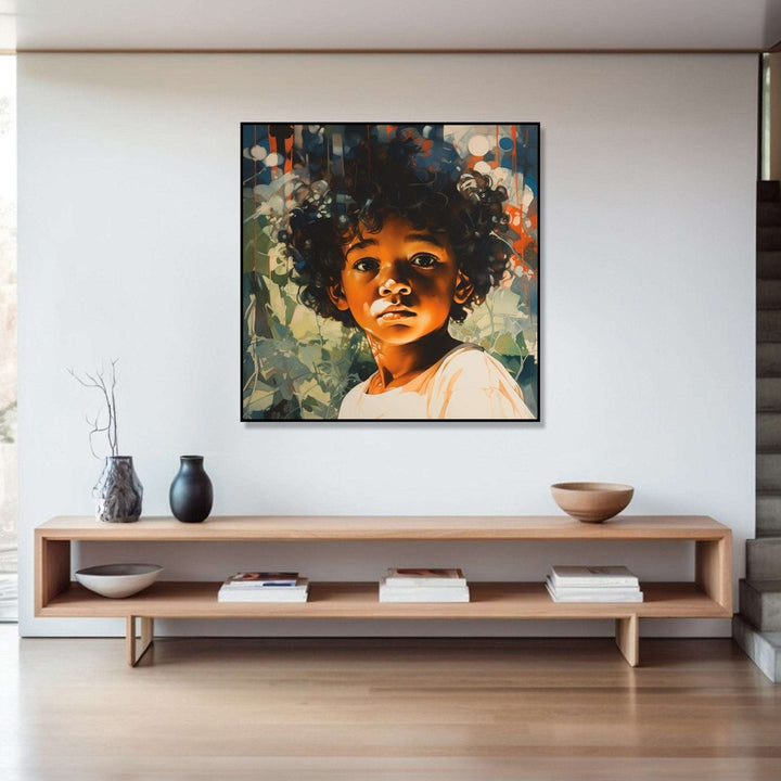 This painting captures the innocence of an African kid with curly hair, wearing a white T-shirt, set against an background.