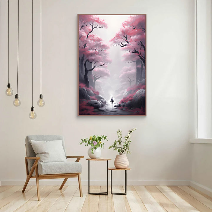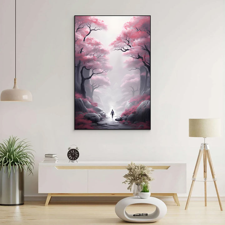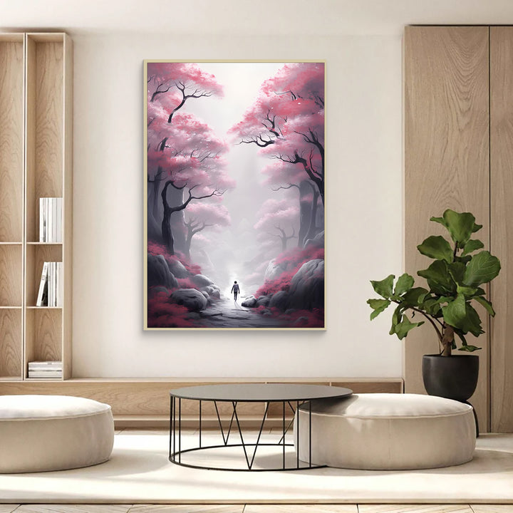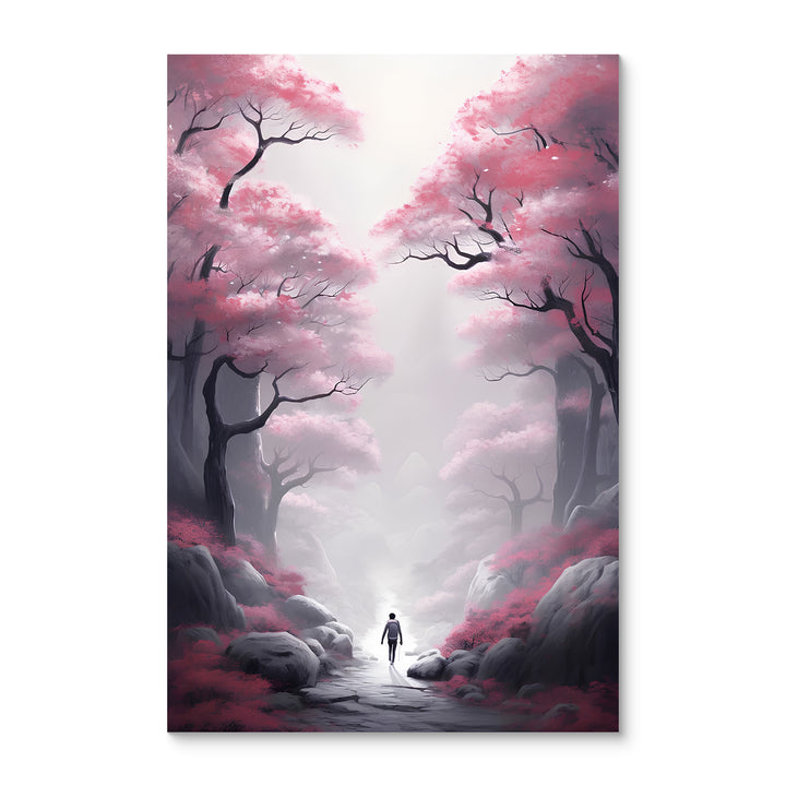 "Japanese Landscape 4" depicts a man walking through a pink forest with tall trees, creating a serene and ethereal atmosphere.