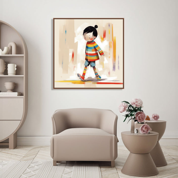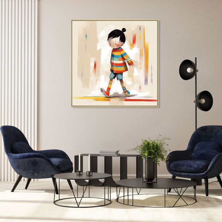 'Joyful Innocence' captures the vibrant spirit of a small Asian boy, his hair styled in a bun, adorned in colourful clothing. The artwork radiates a sense of pure joy and innocence, inviting viewers to embrace the beauty of diversity and cultural expression.