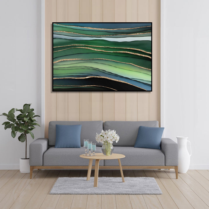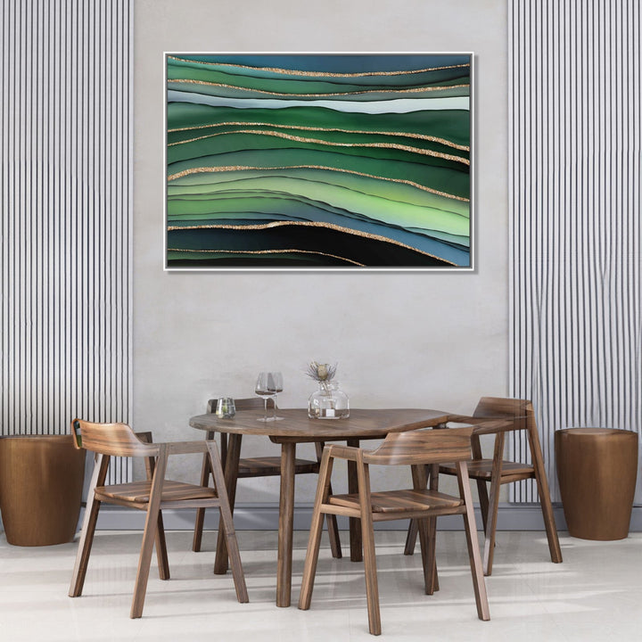 This handmade painting features a mesmerizing abstract composition with waves of green, white, and blue colors flowing seamlessly across the canvas. The colors blend together harmoniously, creating a sense of movement and tranquility. Interspersed throughout the waves are intricate golden line textures, adding a touch of elegance and sophistication to the piece. The contrast between the bold, vibrant colors and the delicate golden lines creates a dynamic visual experience for the viewer. This painting is a stunning example of the artist's skill in creating a captivating and unique abstract artwork.