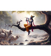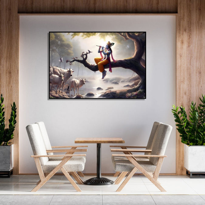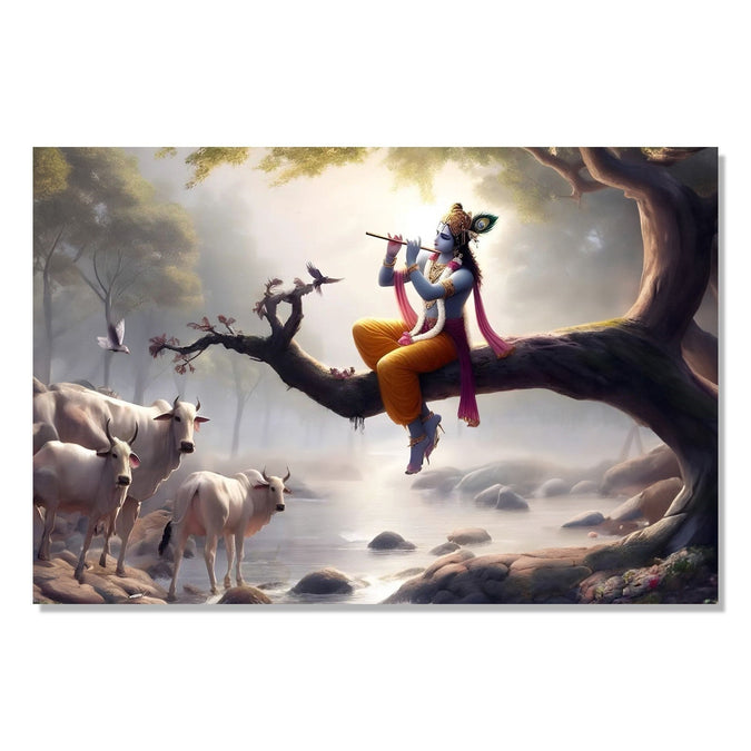 This enchanting painting captures the divine essence of Krishna as he sits gracefully on a tree branch, captivating the world with his melodious flute. The cows, mesmerized by the enchanting music, gather around, their eyes filled with adoration. A gentle stream trickles down, adding a serene touch to the scene. The artist skillfully portrays the tranquility and harmony of nature, while showcasing the spiritual connection between Krishna and his surroundings. This masterpiece invites viewers to immerse themselves in the ethereal beauty of this divine moment.