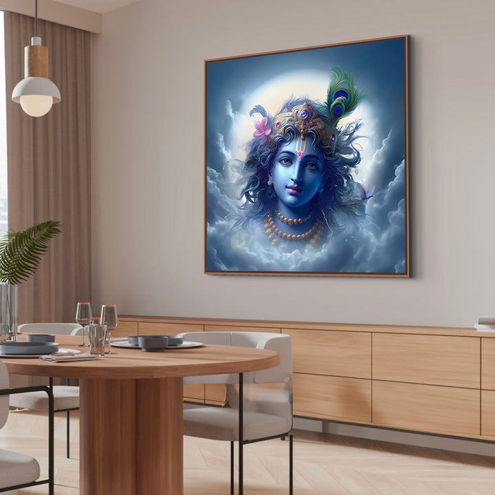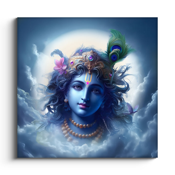 This mesmerizing painting captures the divine essence of Lord Krishna, portrayed with striking blue skin that symbolizes his celestial nature. His face radiates serenity and charm, framed by flowing locks of hair adorned with delicate flowers and peacock feathers, enhancing his playful yet majestic persona. Krishnaí´s exquisite crown, embellished with gems and intricate designs, signifies his royal status as a divine ruler. The golden jewelry around his neck and ears adds to the opulence of his appearance, reflecting the beauty and richness of his character.