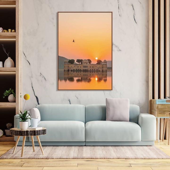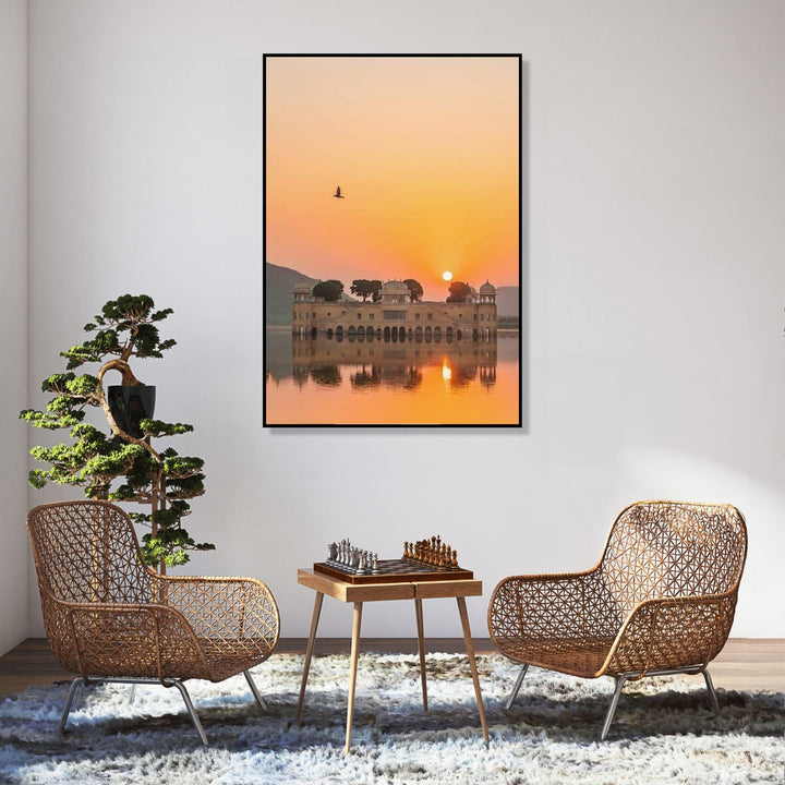 This painting depicts a serene scene of a small palace situated in the middle of a calm lake during sunset. The warm hues of the setting sun cast a golden glow over the water, creating a peaceful ambiance. A solitary bird gracefully soars above the palace, adding a touch of movement to the otherwise still landscape. The artist captures the tranquility and beauty of nature, inviting viewers to immerse themselves in this idyllic setting.