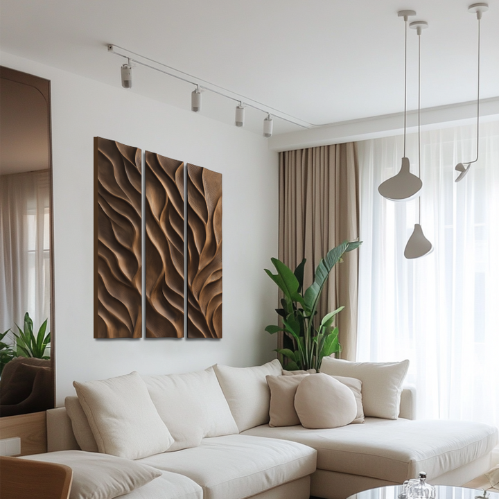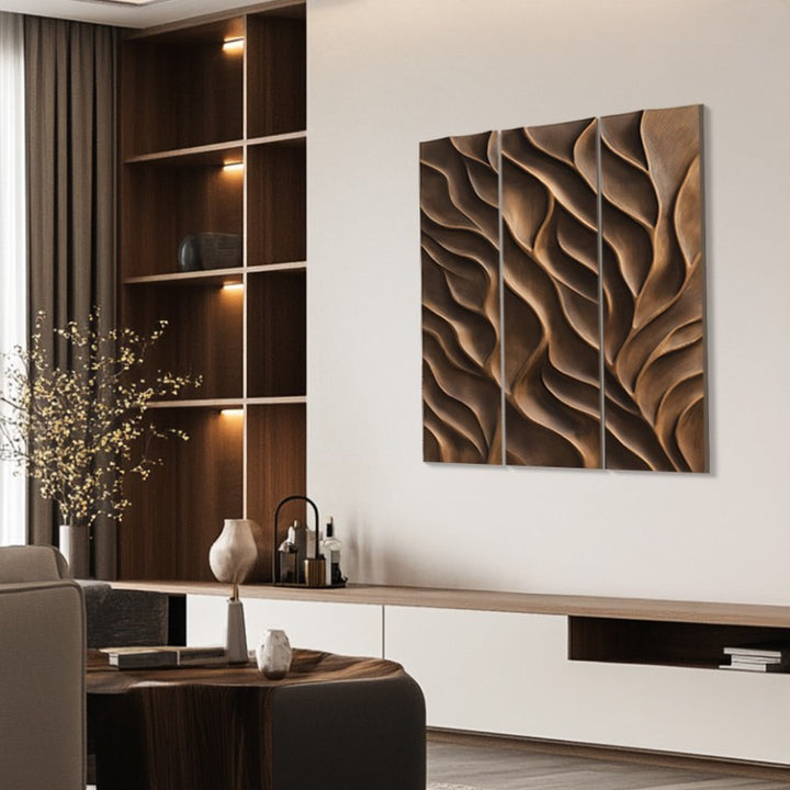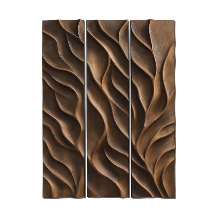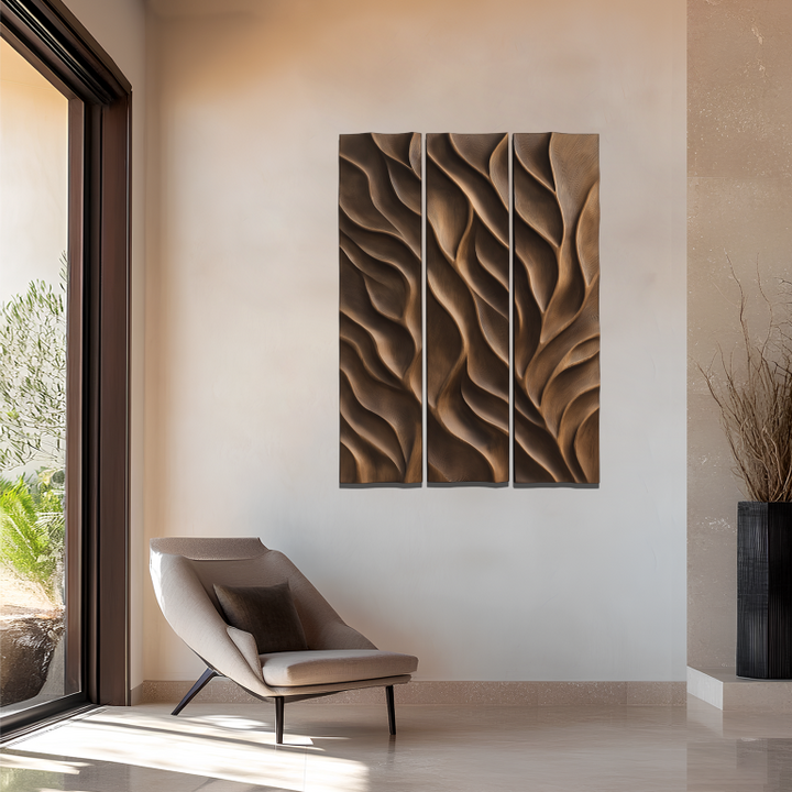 This three-panel artwork presents deep-carved wooden textures resembling natural leaf veins or flowing water. The rich brown finish enhances the naturalistic effect, making it an elegant addition to any space with a nature-inspired theme.