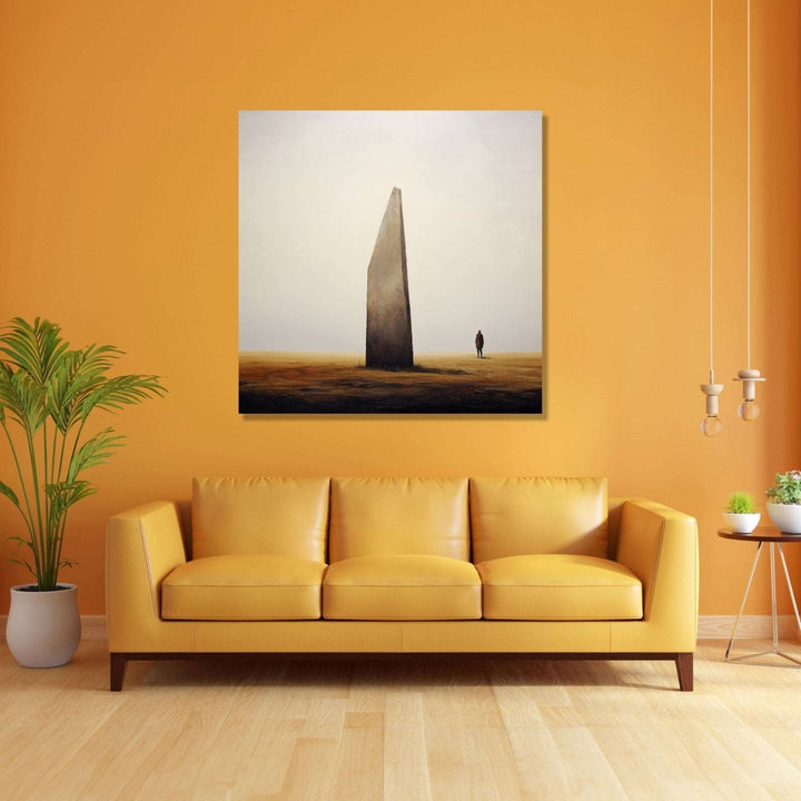 A solitary figure stands beside a towering vertical stone henge, against the earthy minimalist background. The juxtaposition creates a captivating scene, where the man and the monolith converge in a moment of contemplative connection.