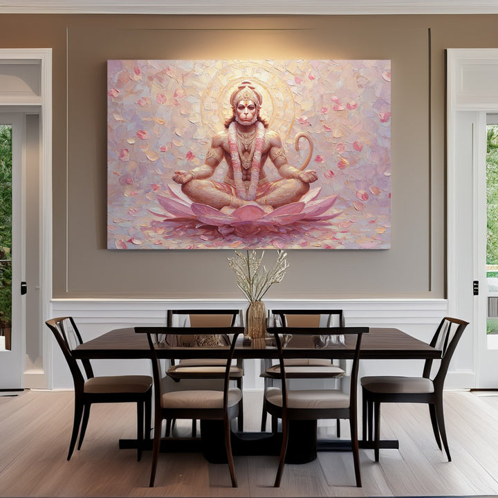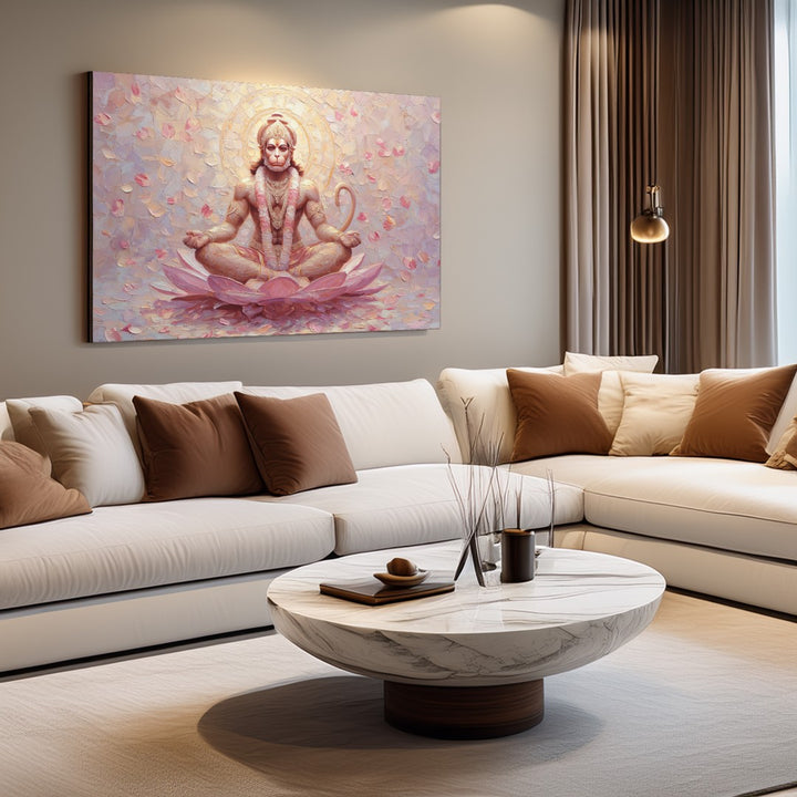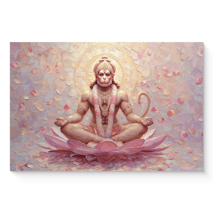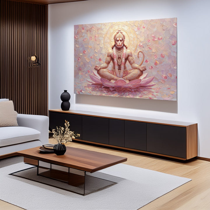 Hanuman Ji sits in lotus pose on a glowing pink lotus flower. A divine expression, floral backdrop, and pastel textures create a soft sacred aura. A unique painting for peaceful interiors, healing rooms, or feminine devotional spaces.