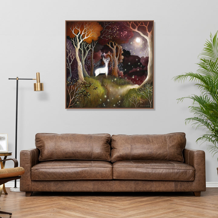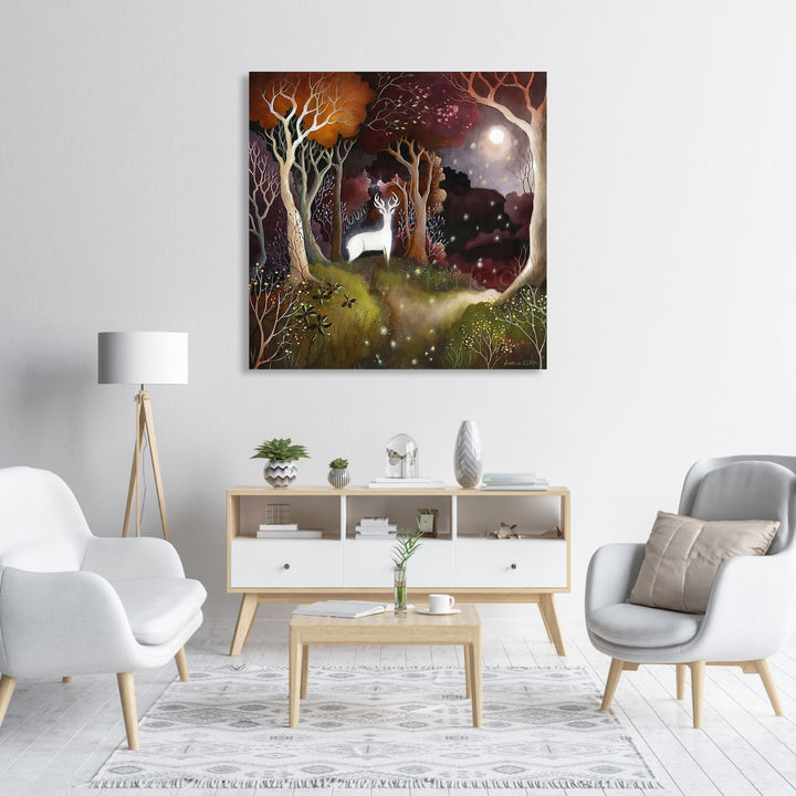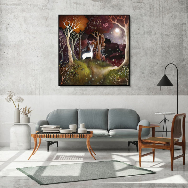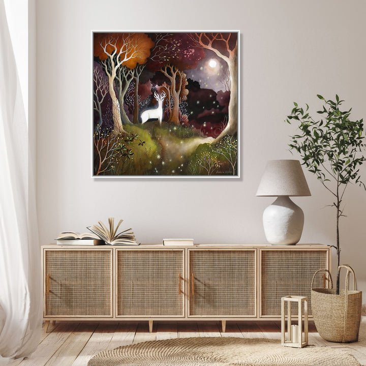 'Majestic Moonlit Encounter' depicts a stunningly bright white stag standing tall amidst a lush jungle. The artist has skillfully used a brown and dark green color palette to create a captivating night scene, evoking a sense of mystery and enchantment.