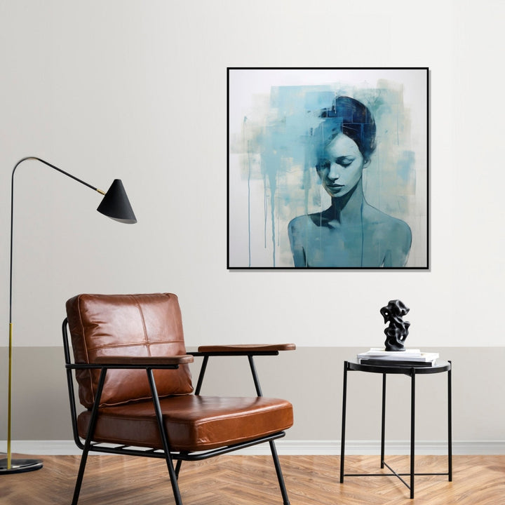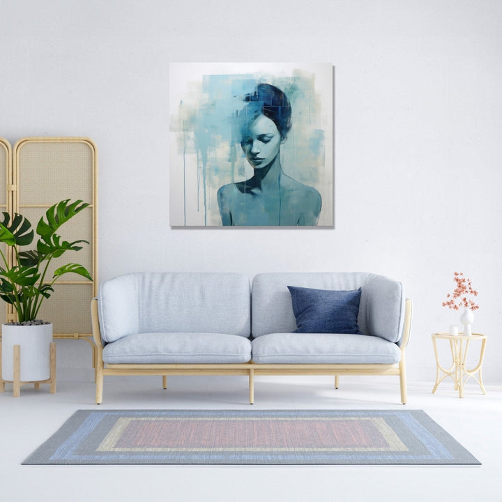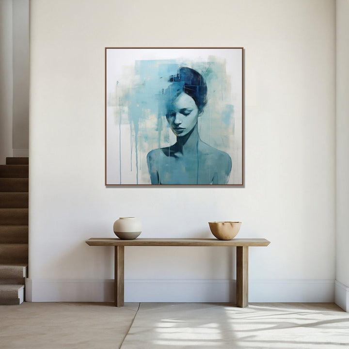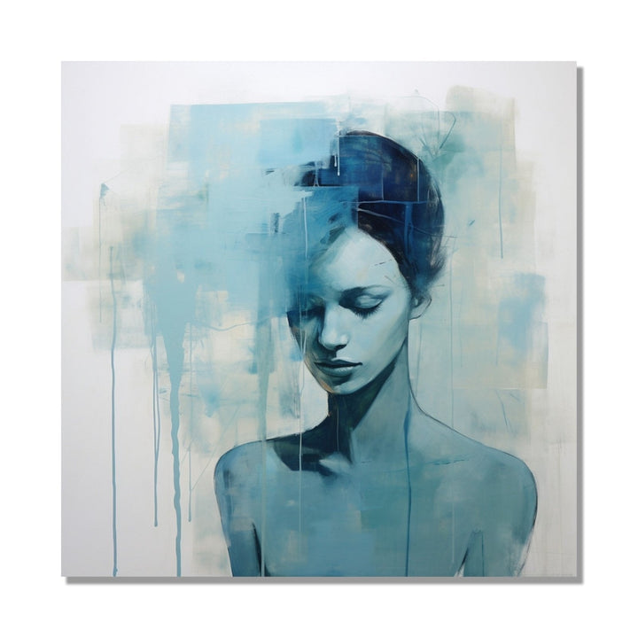 A woman's visage, bathed in shades of blue, conveys a profound sense of emotions as she gazes downward. Against a serene white background, the subtle nuances of her expression create a poignant tableau of introspection. "Melancholy Reflection" captures a moment of contemplative emotion, inviting viewers to connect with the depth of human experience.