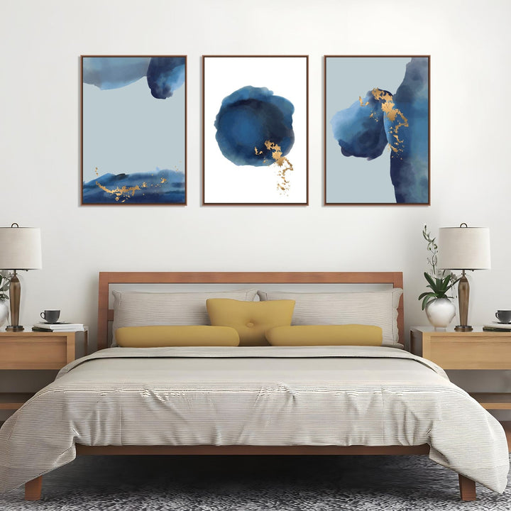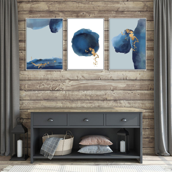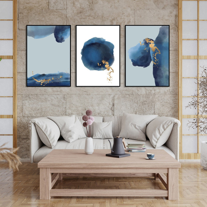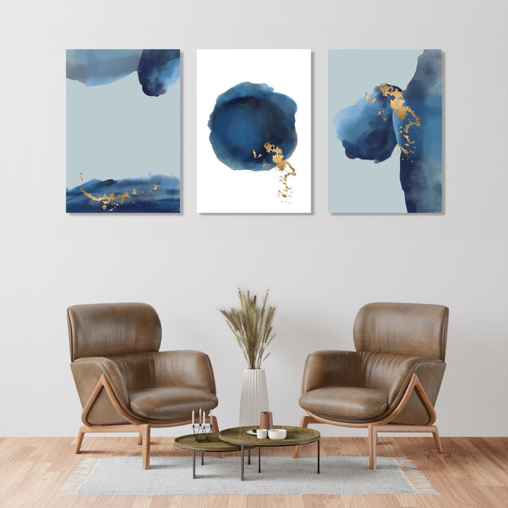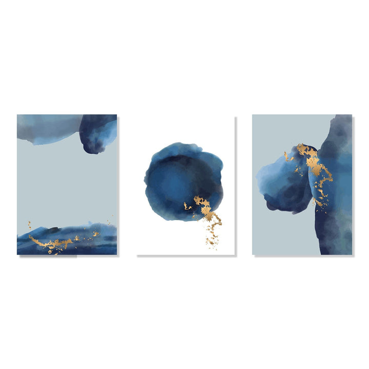 These three abstract paintings are a stunning display of deep blue and navy watercolor blotches, each uniquely composed to create a sense of movement and depth. The rich, saturated colors blend together seamlessly, creating a mesmerizing visual experience for the viewer. The addition of gold splatter adds a touch of luxury and sophistication to the artwork, contrasting beautifully with the cool tones of the blues. In the central panel, a large, roundish blue blotch commands attention, drawing the eye in and inviting contemplation. The overall effect is one of harmony and balance, with each painting offering a different perspective on the interplay of color and form. These handmade pieces are a true work of art, sure to enhance any space with their beauty and elegance.