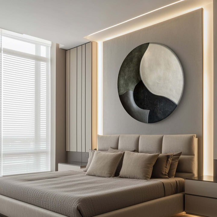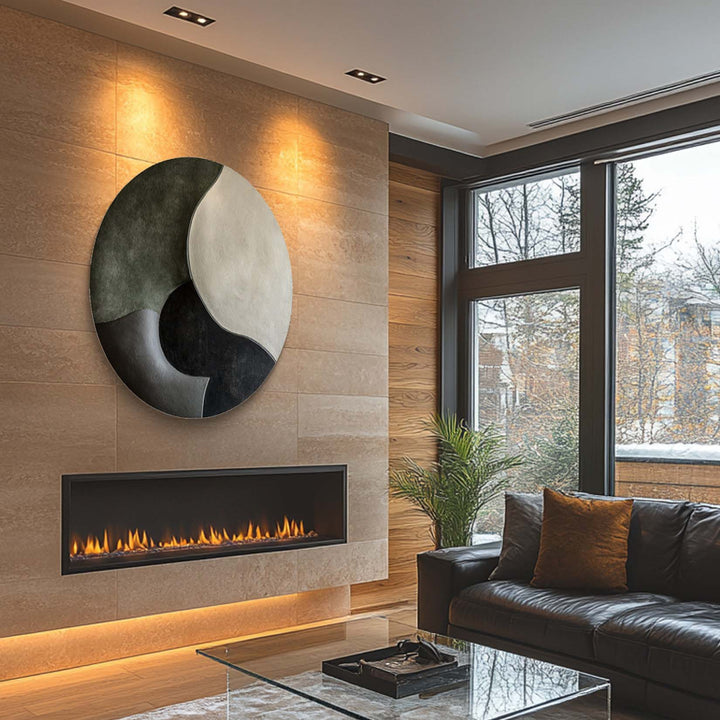 A minimalist 3D wall art inspired by the Yin-Yang philosophy, featuring gentle curves in muted green, beige, and black tones. A perfect addition to contemporary and zen-inspired interiors.