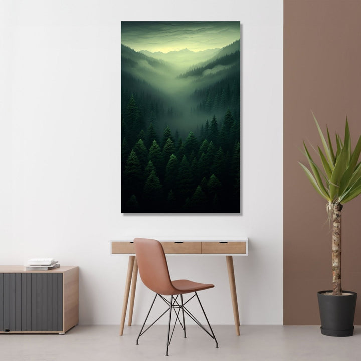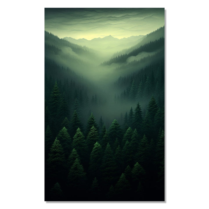 "Mist in the Valley" presents a dark green-colored misty valley, evoking a sense of mystery and tranquility.