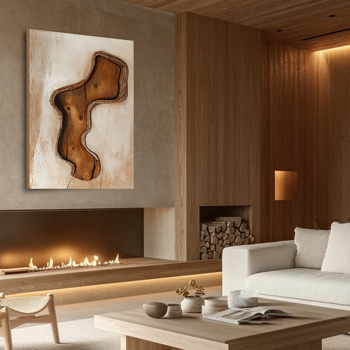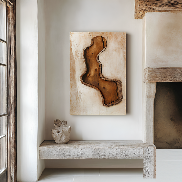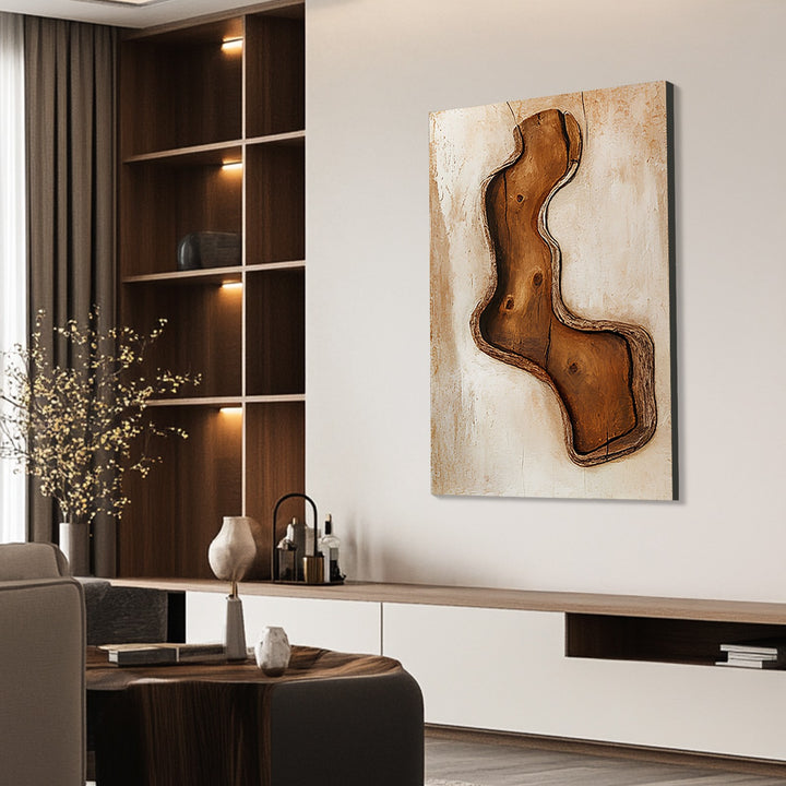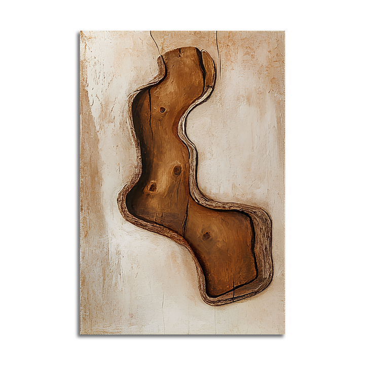 This artwork captures the organic beauty of natural wood, with a carved section resembling flowing water or a winding river. The warm brown tones add an earthy aesthetic, making it an ideal decor piece for rustic and contemporary interiors.