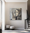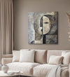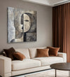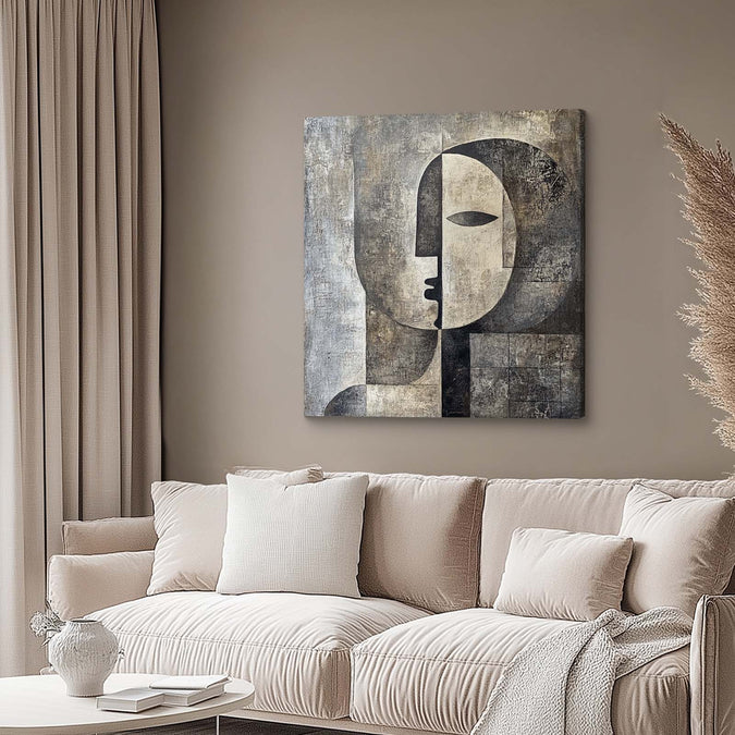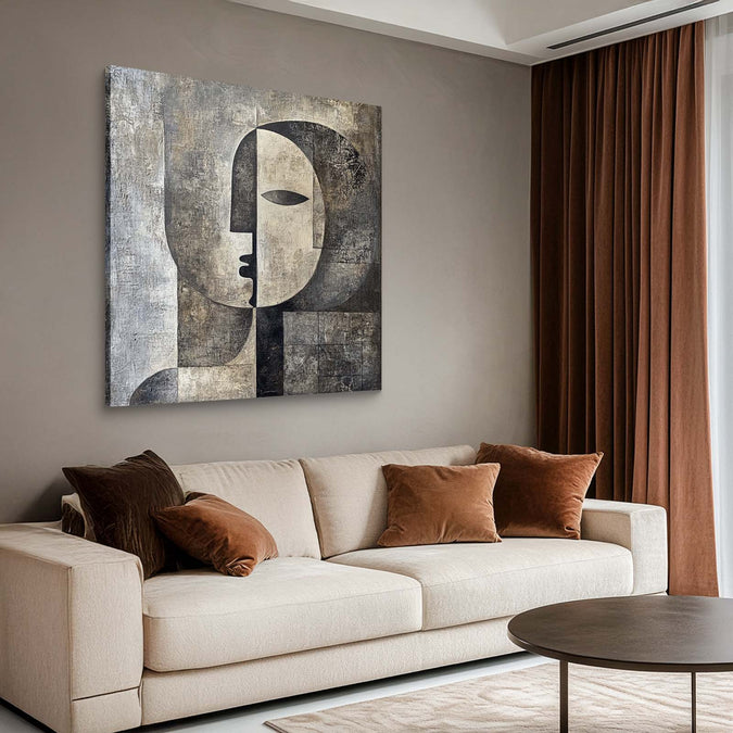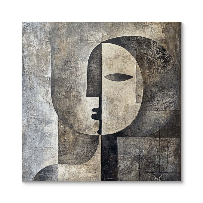Modern abstract portrait employing cubist techniques, characterized by bold geometrical lines and muted tones.
