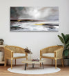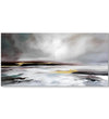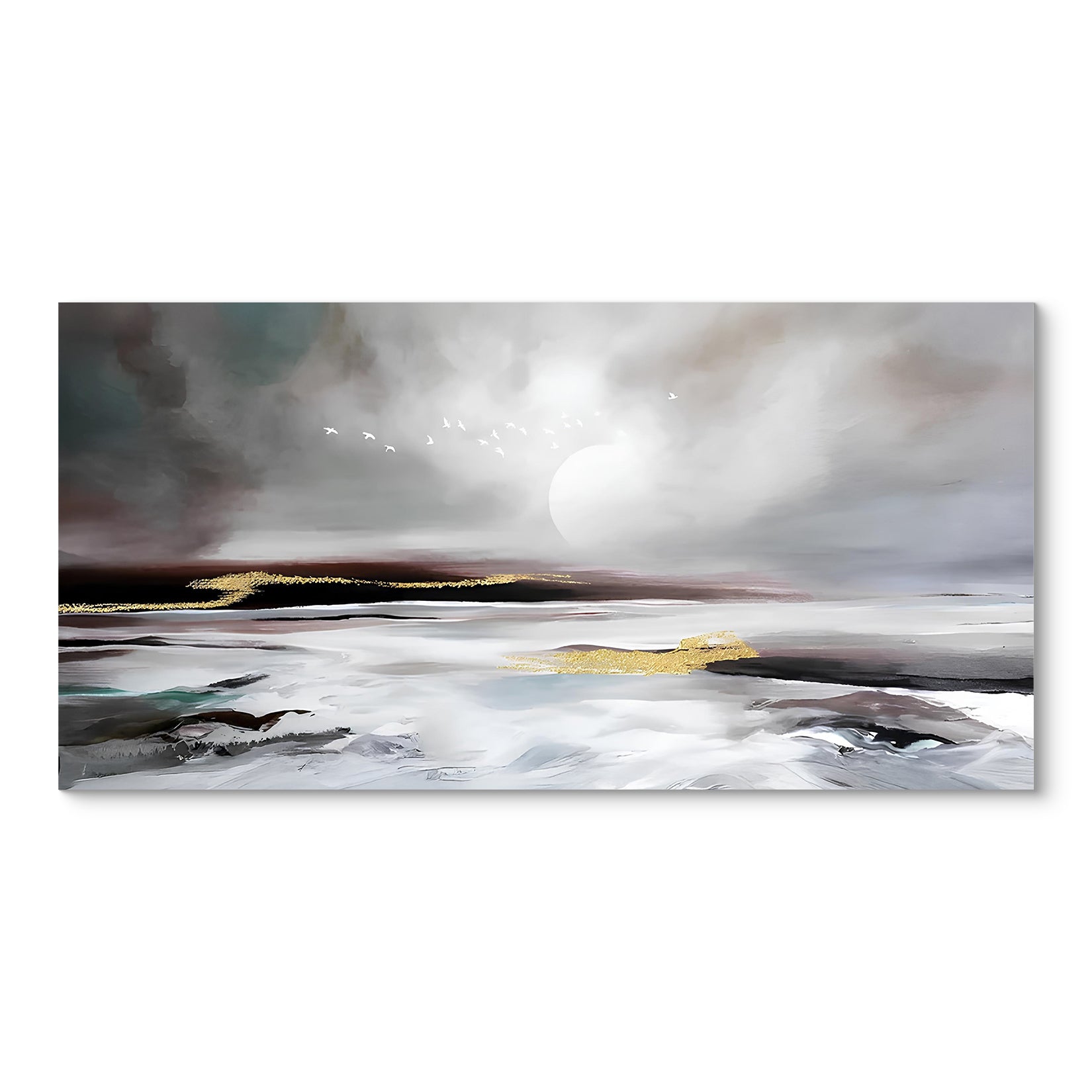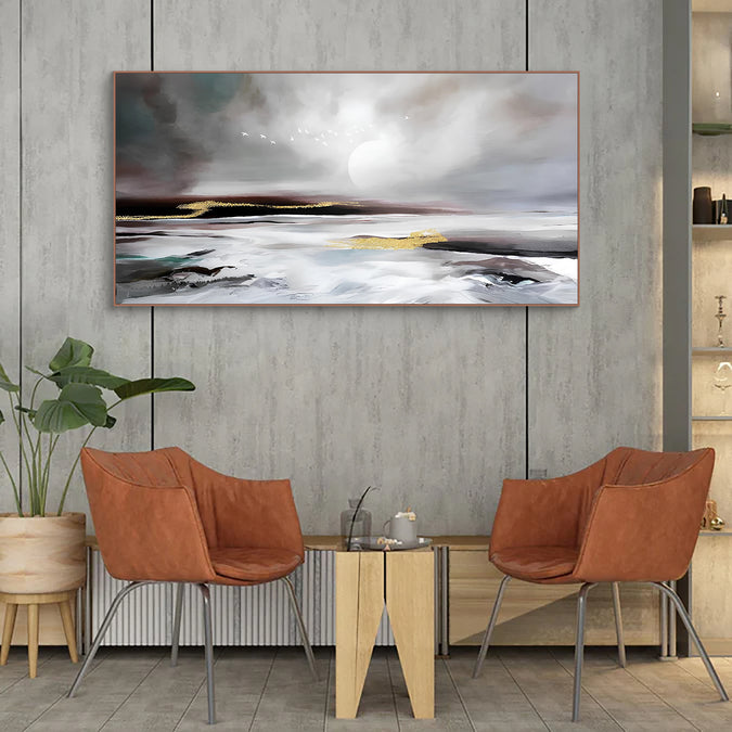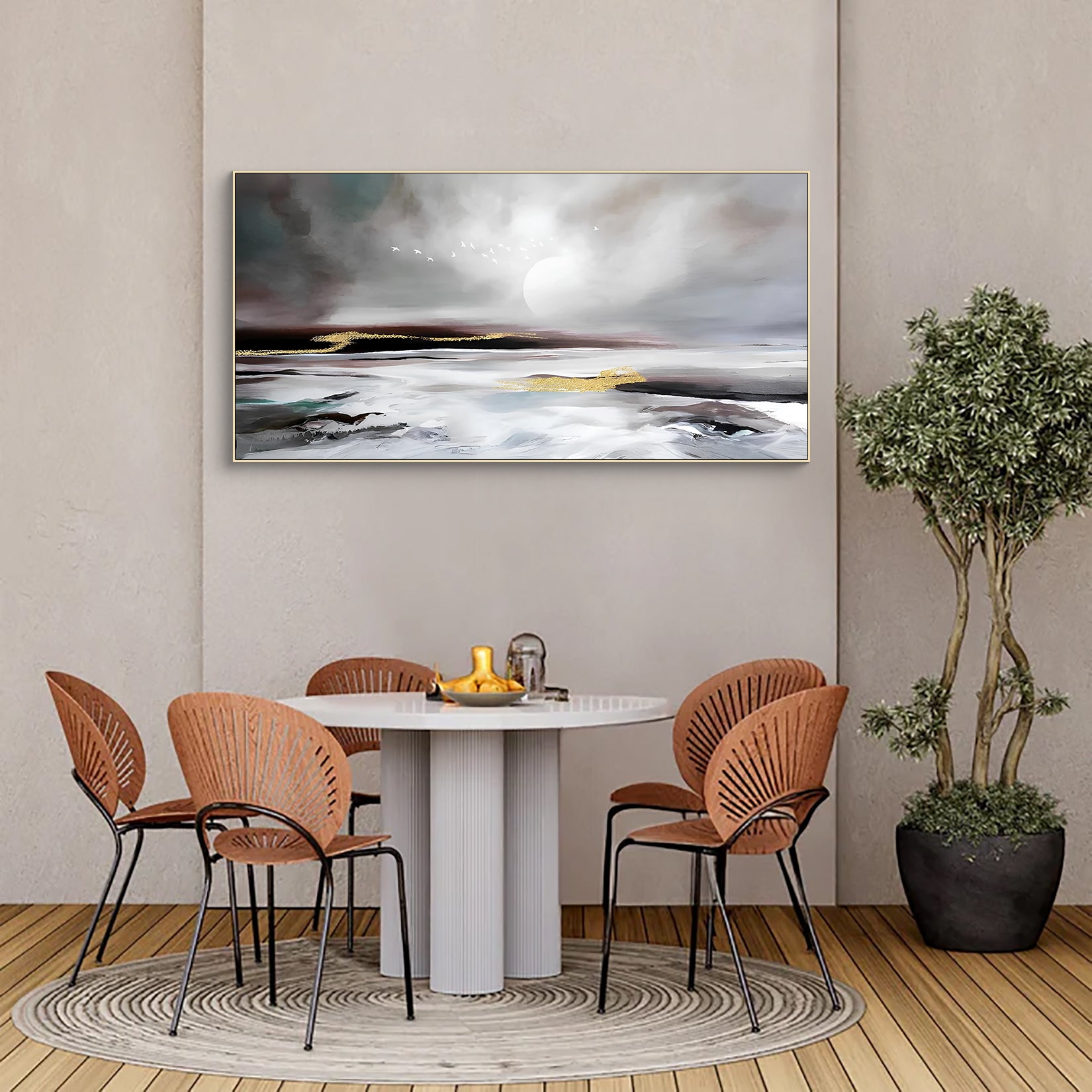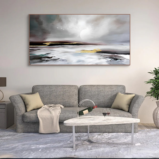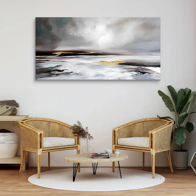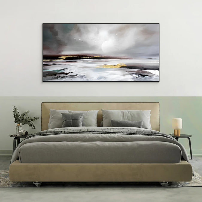This handmade painting captures a tranquil landscape scene with incredible attention to detail. The focal point of the painting is a luminous celestial body shining brightly in the sky, casting a soft glow over the entire scene. Dark, ominous clouds swirl overhead, adding a sense of drama and contrast to the peaceful setting below. A reflective water body stretches out in the foreground, perfectly mirroring the colors of the sky above. The silhouettes of distant landforms can be seen in the background, adding depth and perspective to the composition. In the distance, a flock of birds can be seen flying across the sky, adding a sense of movement and life to the otherwise still scene. The artist has used a combination of bold brushstrokes and delicate details to create a sense of realism and atmosphere in the painting. The colors are rich and vibrant, with a harmonious blend of blues, purples, and oranges creating a stunning visual impact. Overall, this handmade painting is a masterful depiction of nature's beauty and tranquility.