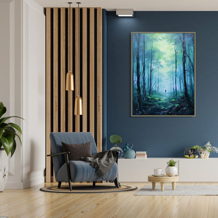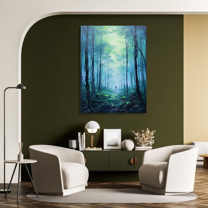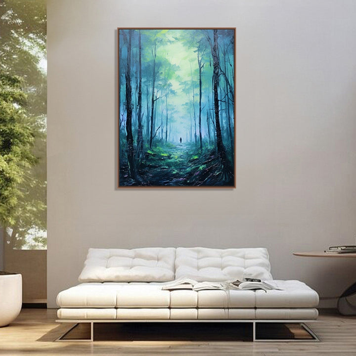'Mystical Jungle Path' captures the tranquil ambience of a dense forest, with tall tree trunks reaching towards the sky against a soothing bluish background. The serene atmosphere invites viewers to immerse themselves in the beauty and tranquillity of nature.