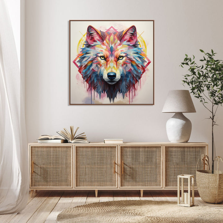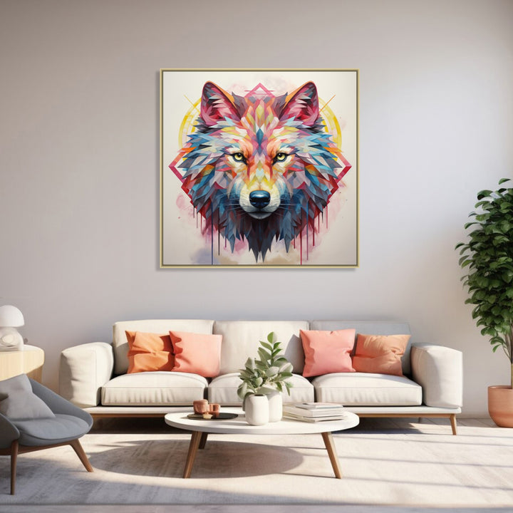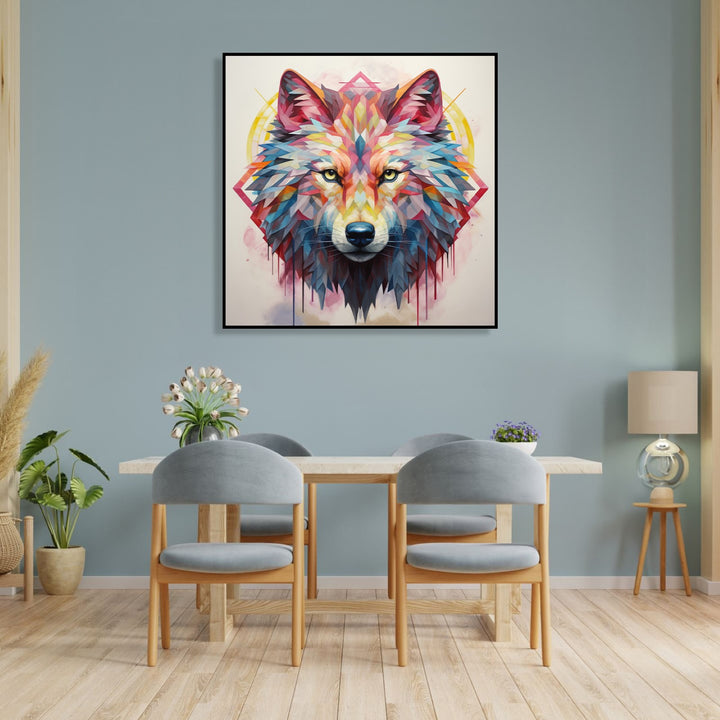 'Mystical Guardian' depicts a majestic wolf against a backdrop of pink and light blue hues. The wolf's piercing yellow eyes captivate the viewer, while intricate triangular patterns add an element of mystique and intrigue to the overall composition.