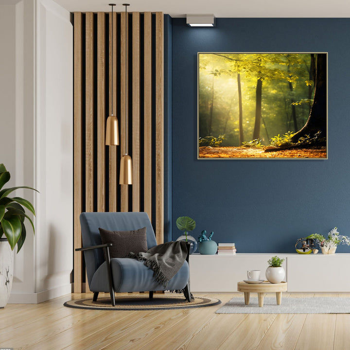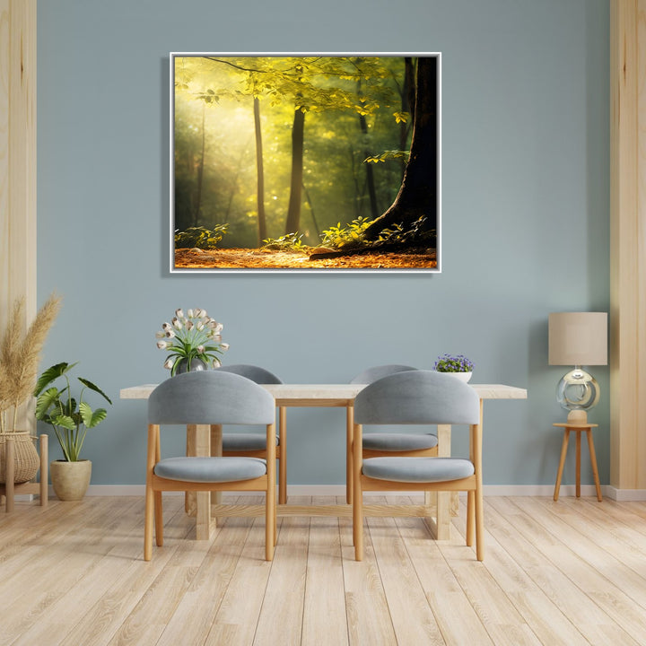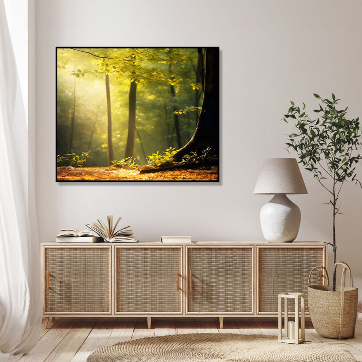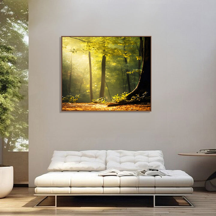 'Nature' captures the serene beauty of a tree trunk amidst a rustic mud forest floor. The vibrant green background, adorned with scattered tree trunks, adds depth and tranquillity to the scene, showcasing the harmonious coexistence of nature's elements.