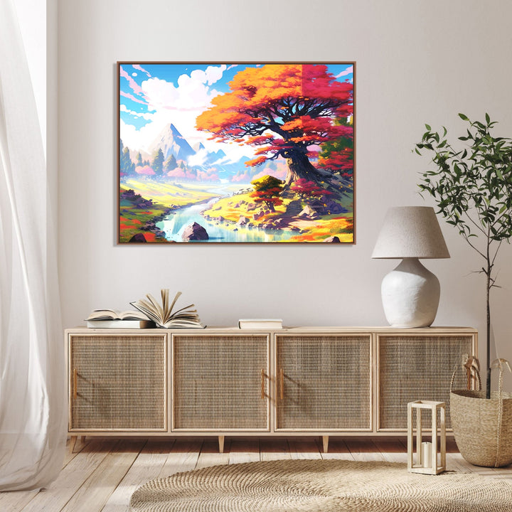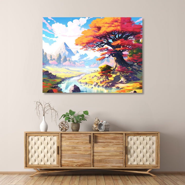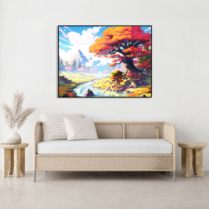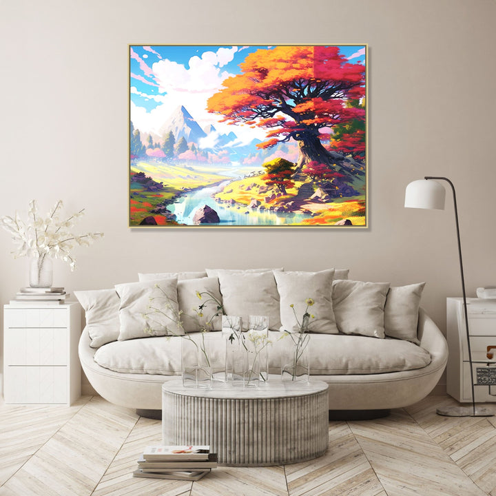 'Harmony of Nature' captures the serene beauty of a vibrant orange tree standing gracefully on the side, with a gentle stream flowing nearby. The surrounding trees and majestic mountains create a harmonious backdrop, inviting viewers to immerse themselves in the tranquillity of nature.