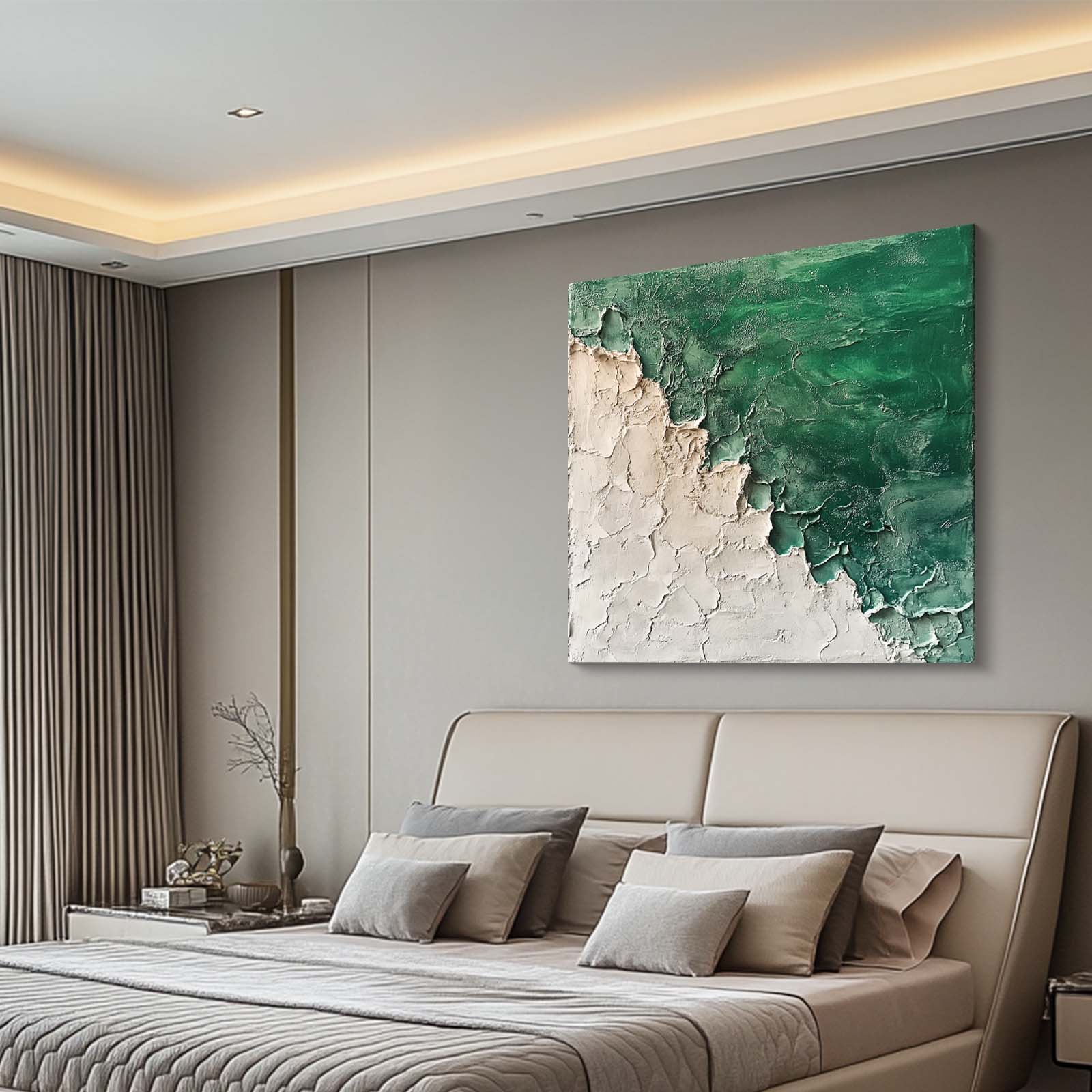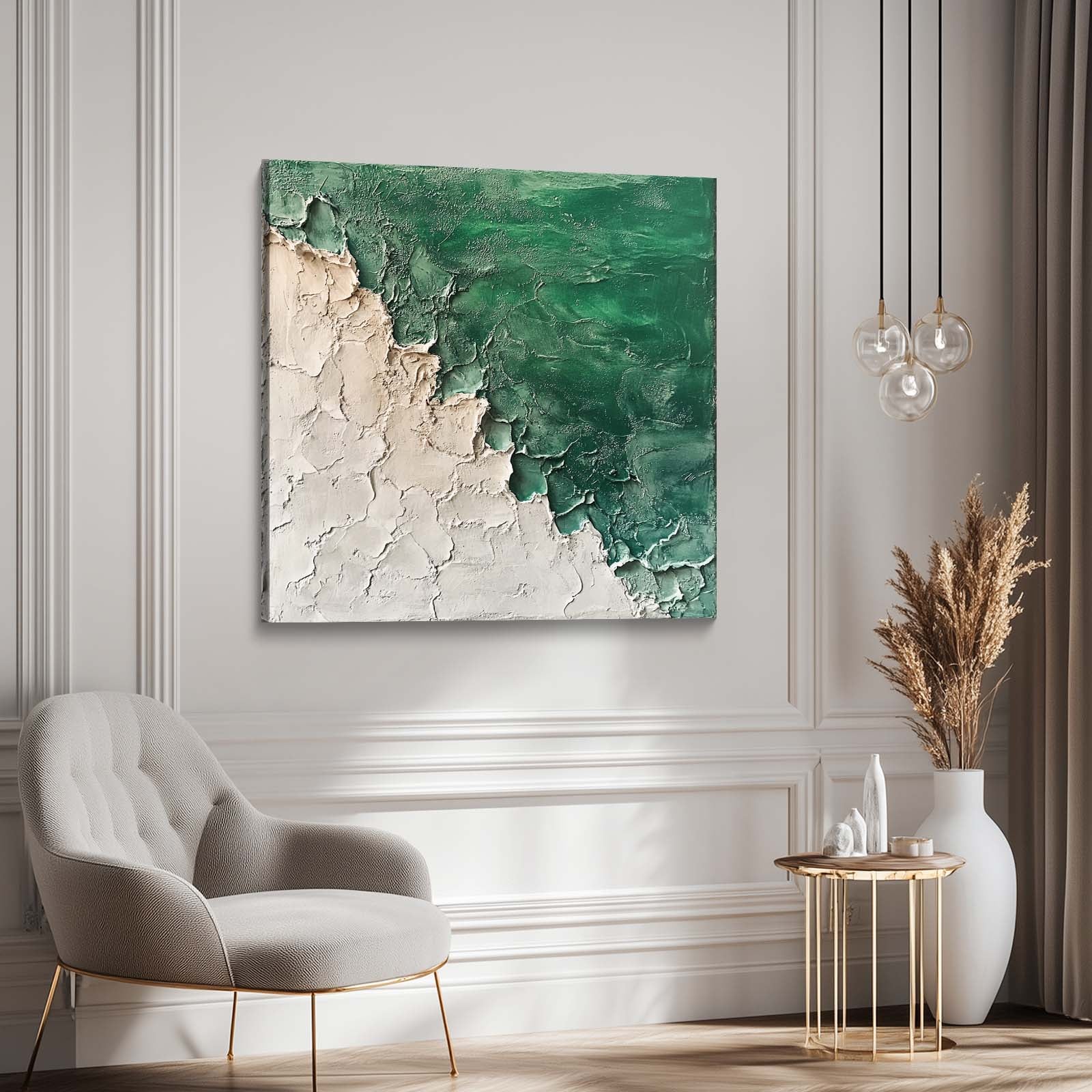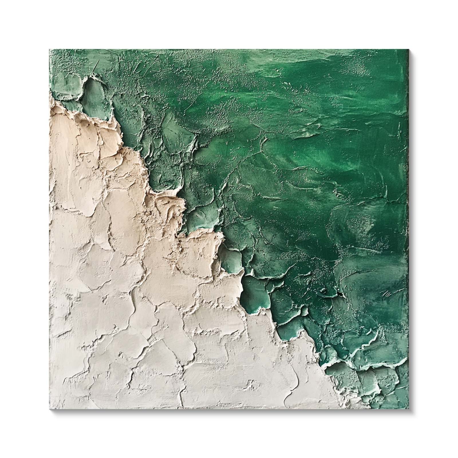 Captures the essence of ocean waves meeting sandy shores through deep textures and contrasting colors.