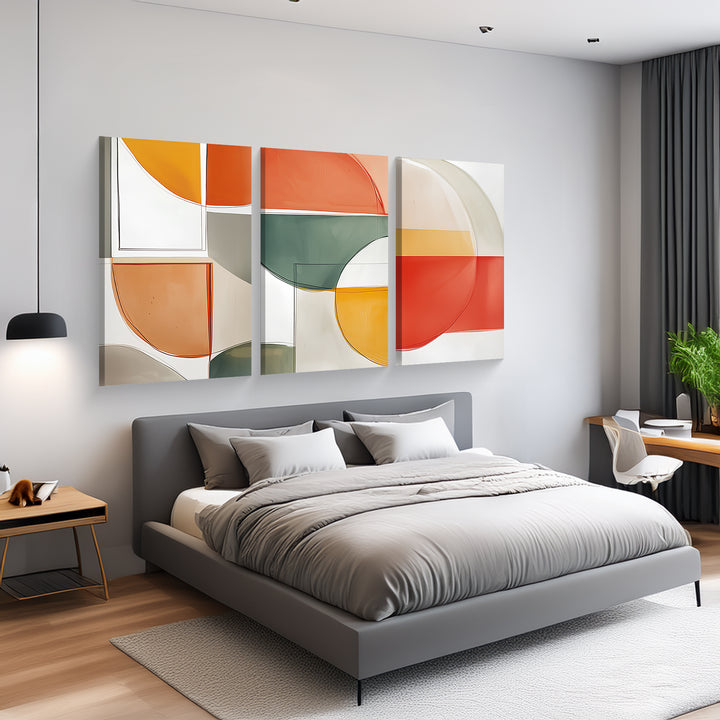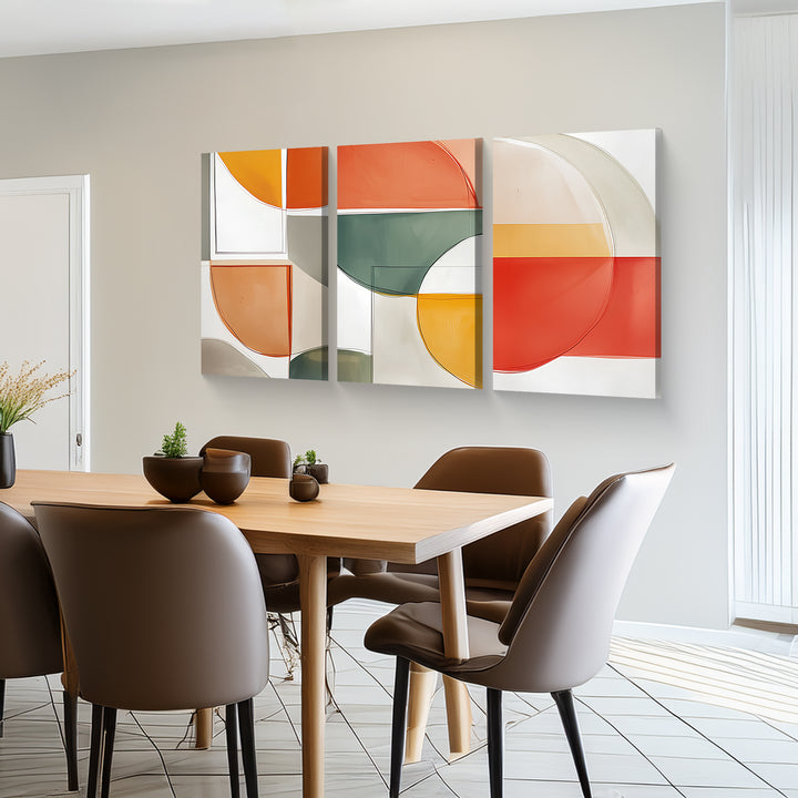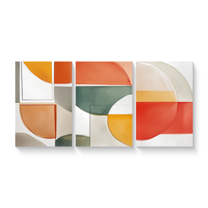 A vibrant and playful abstract series of three panels using semi-transparent blocks in orange, green, yellow, and ivory tones. Energetic and modern.