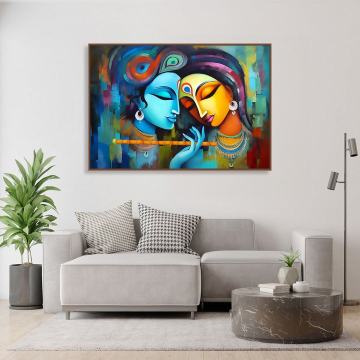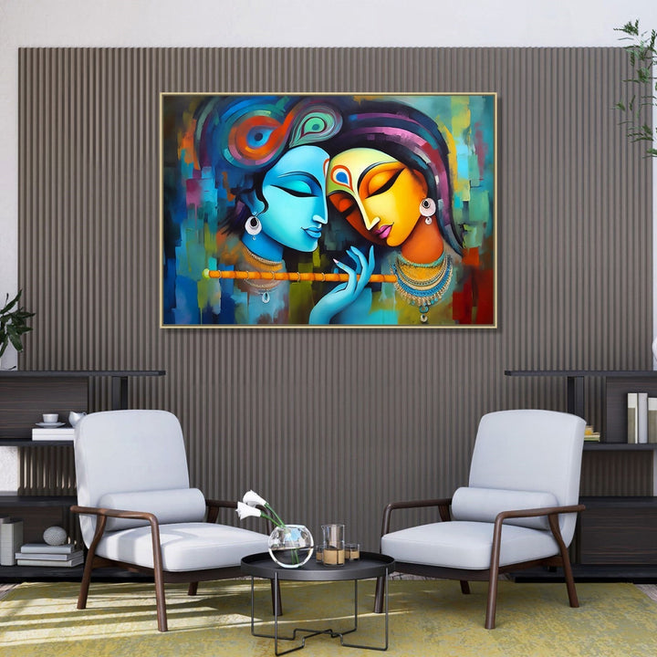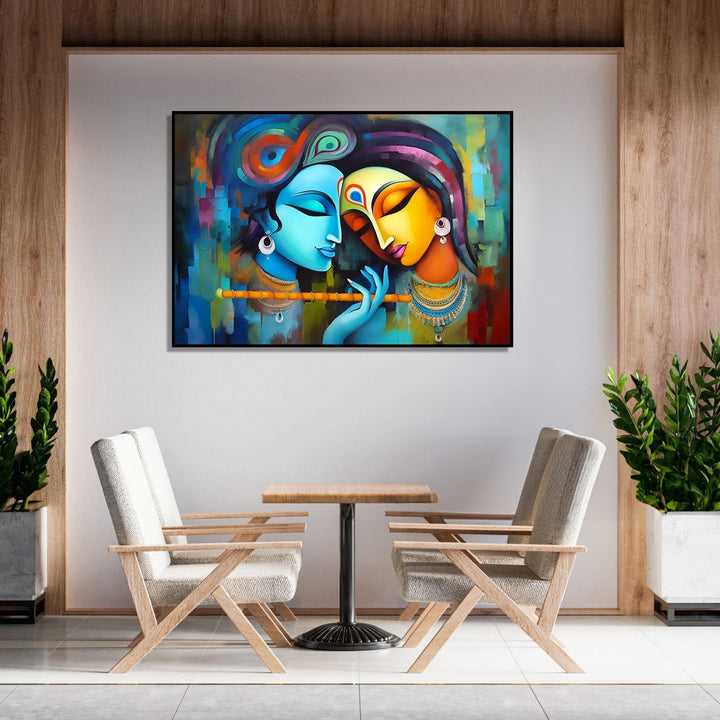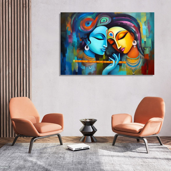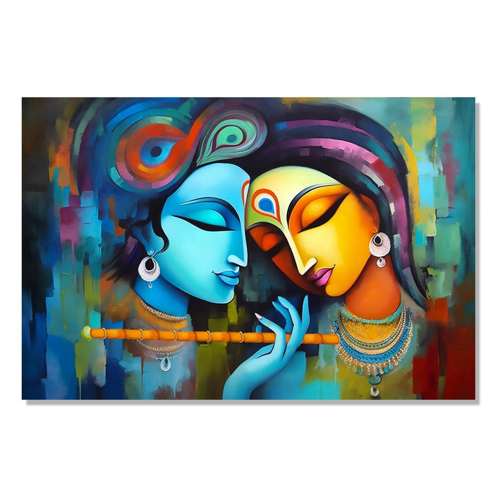 The painting depicts Radha and Krishna, both deep in contemplation, with their eyes closed and holding flutes in their hands. The artwork has a flowing and patchwork style, with vibrant colors and intricate details. The serene expressions on their faces suggest that they are lost in their own thoughts, perhaps reflecting on their divine love and connection. The overall composition exudes a sense of tranquility and spirituality, inviting viewers to immerse themselves in the beauty and symbolism of this timeless scene.