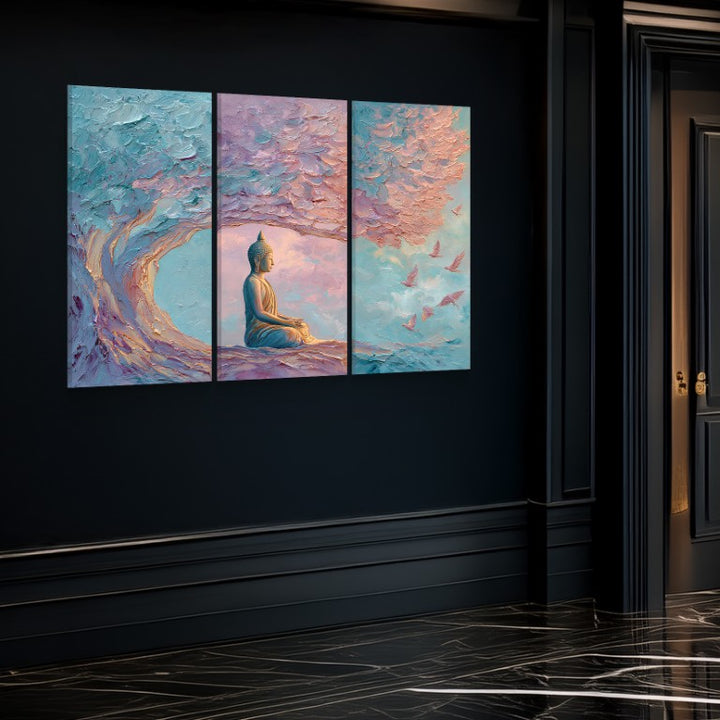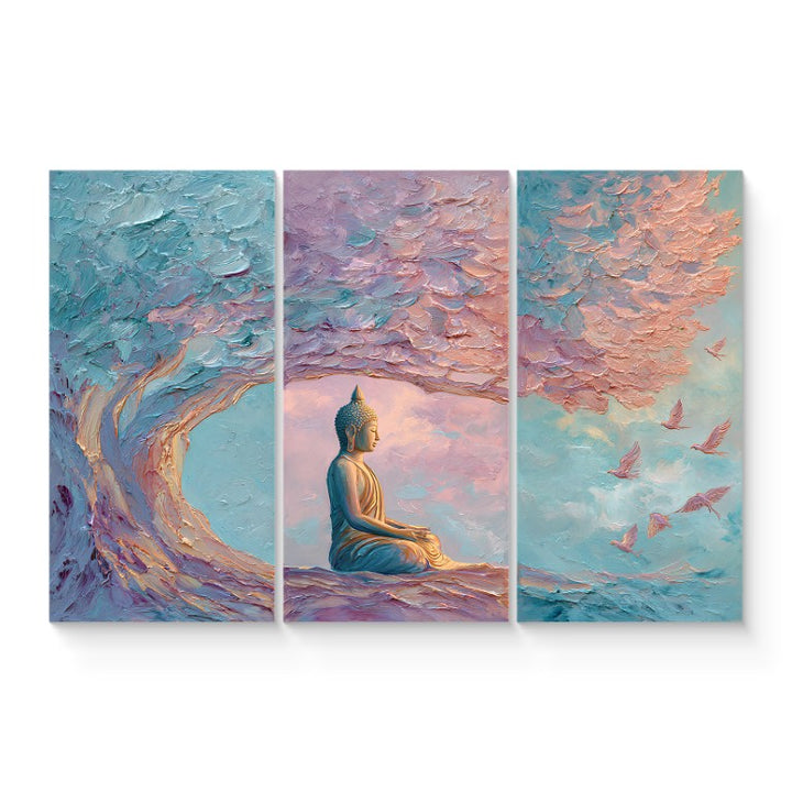 A 3-panel handmade textured painting featuring Lord Buddha meditating under a blossoming pastel tree with flying birds. The Texture palette knife strokes and soothing pink-blue tones make it ideal for meditation corners or peaceful living room decor.