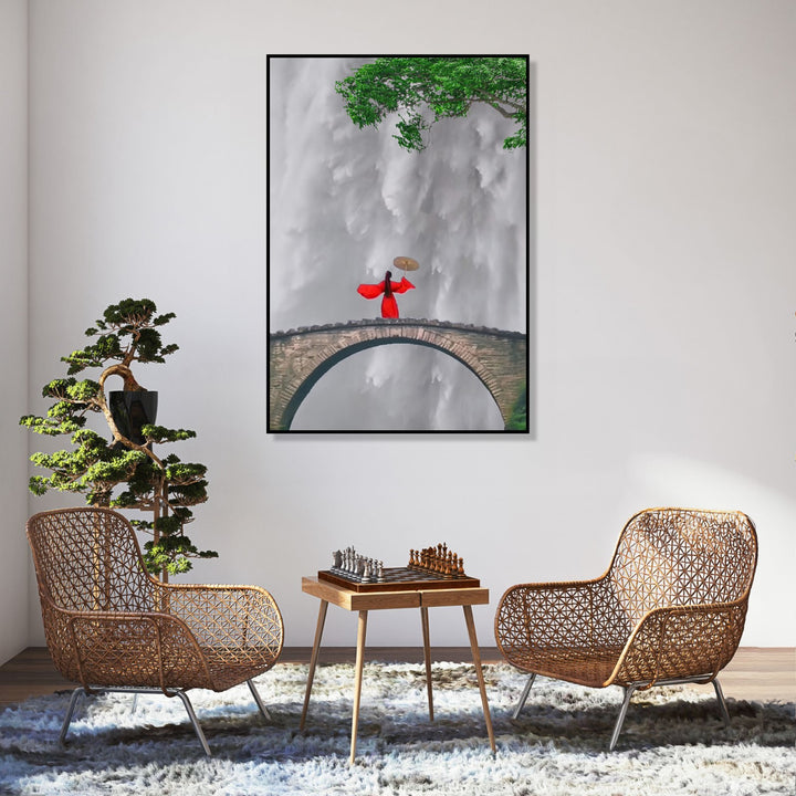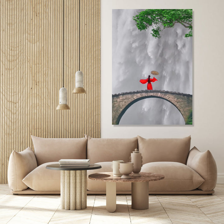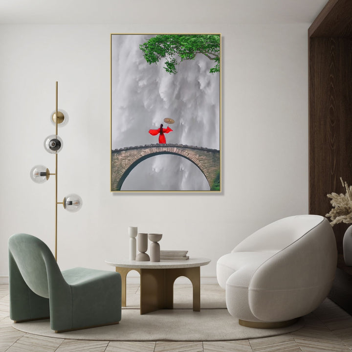 'Serene Elegance 1' captures the tranquil beauty of a white waterfall cascading down rocks, while a lady in a vibrant red dress stands gracefully on a bridge, holding an umbrella. The scene is further enhanced by the presence of lush green tree branches in the top right corner, adding a touch of natural serenity to the overall composition.