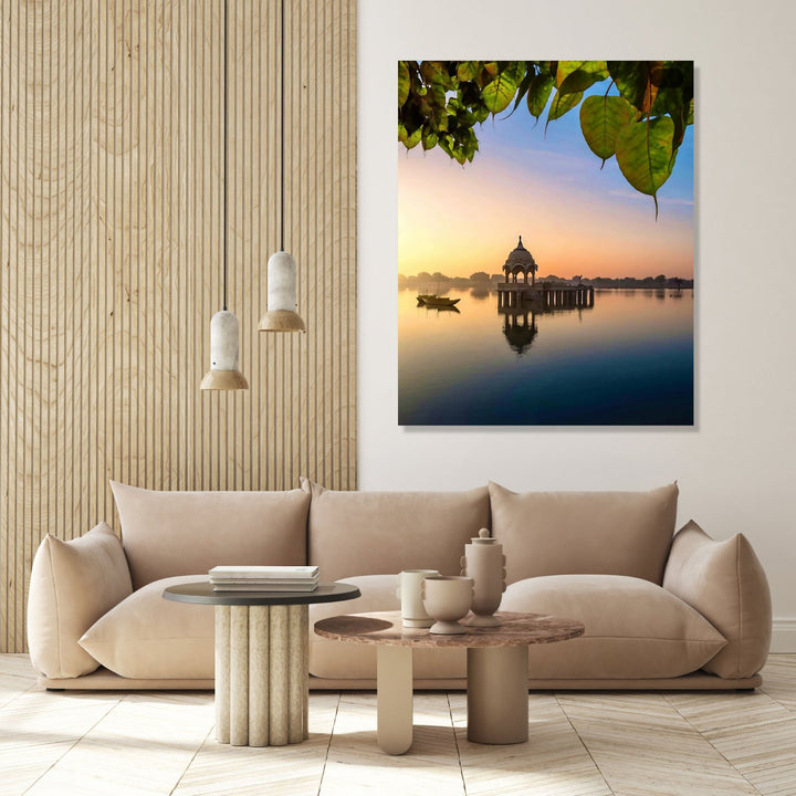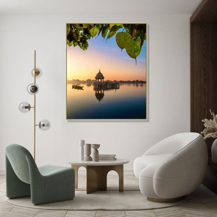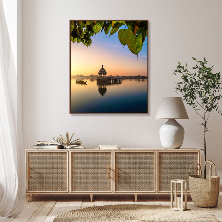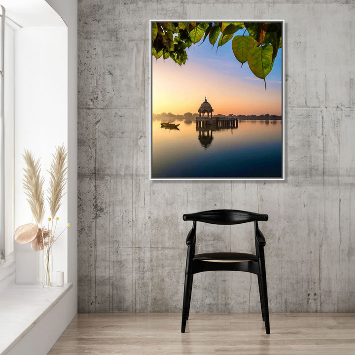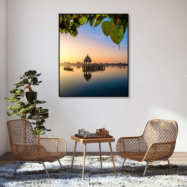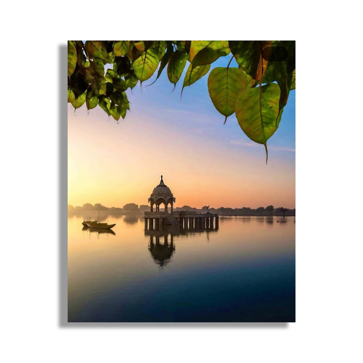 'Serene Reflections' captures the tranquil beauty of a Chhatri (traditional Indian umbrella) standing gracefully in a serene lake, reflecting itsÍ_†�Ǐ_Í__ÍîÍ_Í_†�Ǐ__earthy colours andÍ_†�Ǐ_Í__ÍîÍ_Í_†�Ǐ__everlasting shape. Peepal leaves from top completes the frame, balancing the shades of darkness in the water towards bottom.