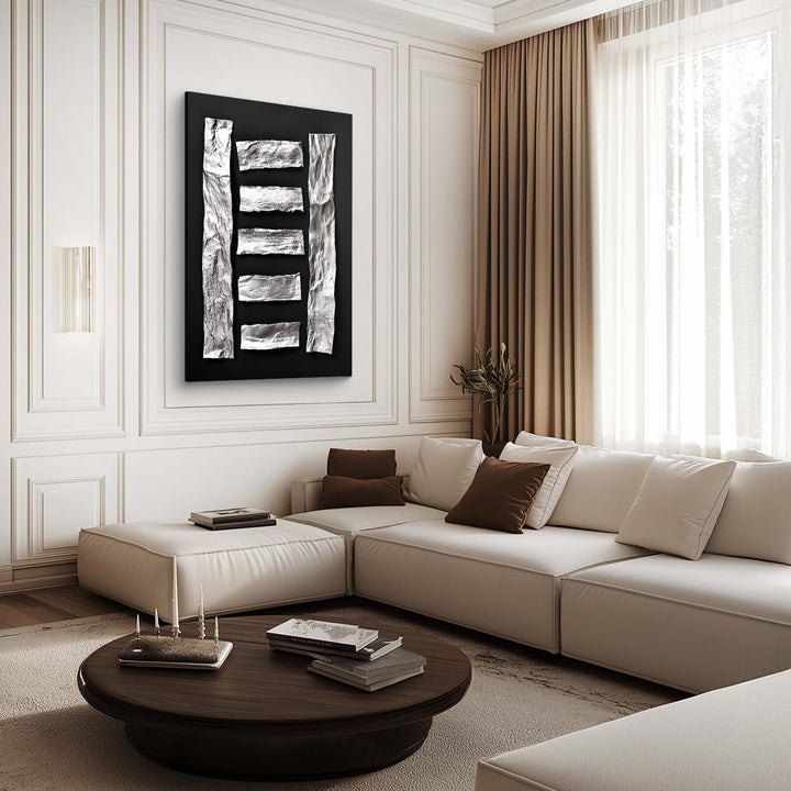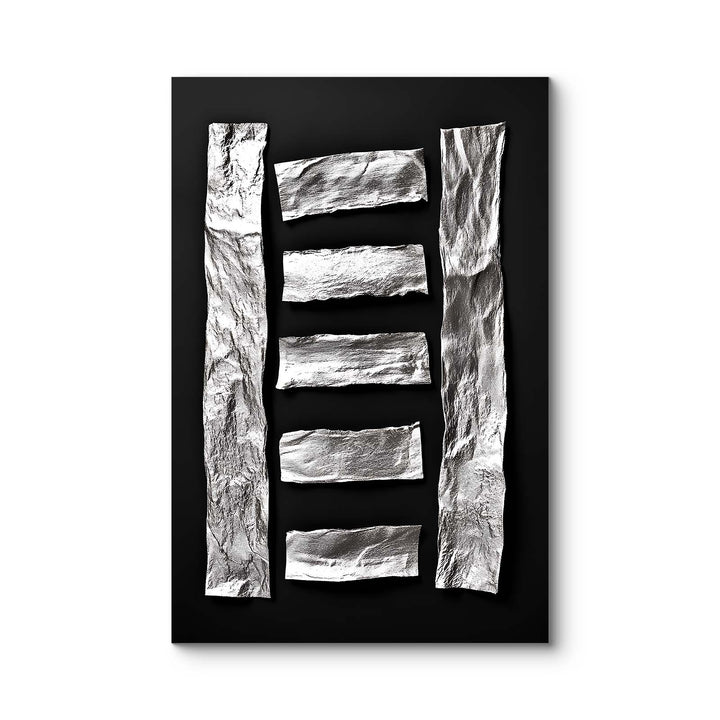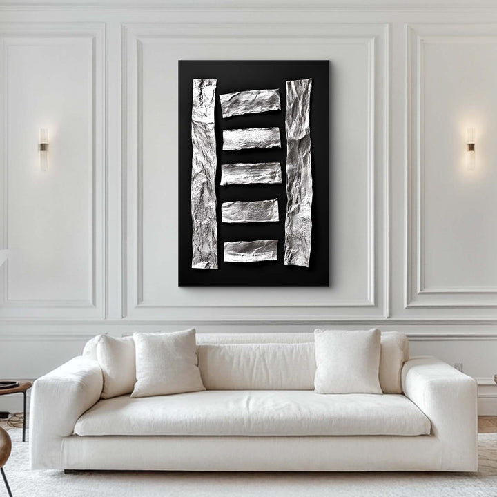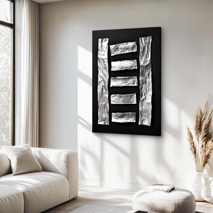 This unique silver foil abstract art piece features carefully arranged metallic strips on a dark background, adding a luxurious and modern touch to any space.