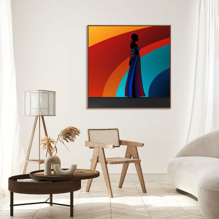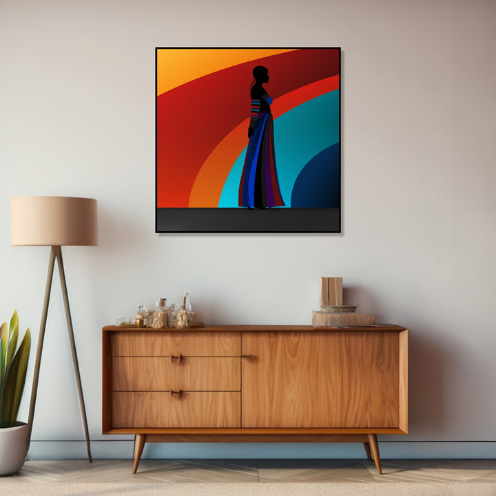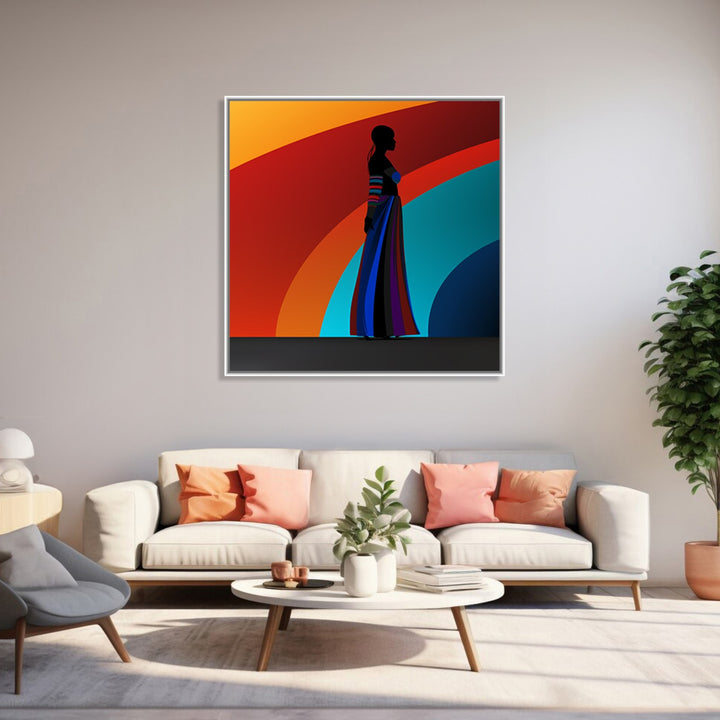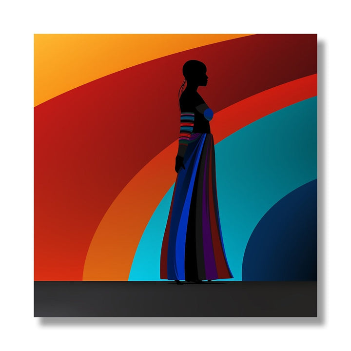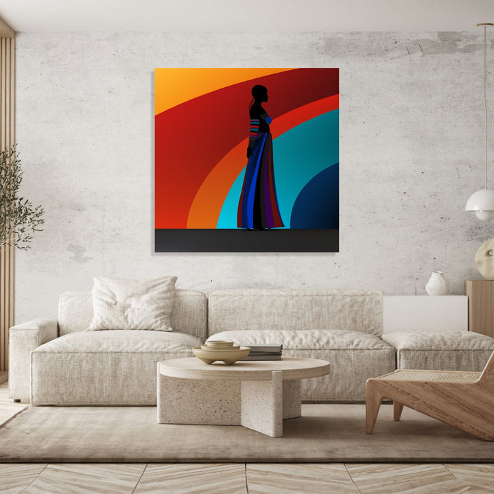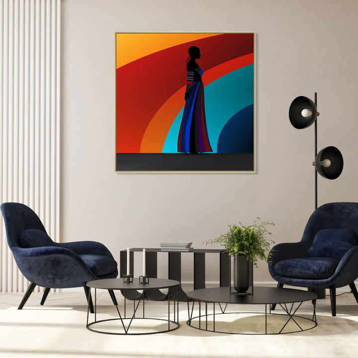 'Solitude in a Vibrant World' depicts a single woman figure standing gracefully against a backdrop of vibrant and contrasting colours. The colourful background symbolises the dynamic and diverse world around her, while the solitary figure represents her inner strength and resilience in navigating through life's complexities.