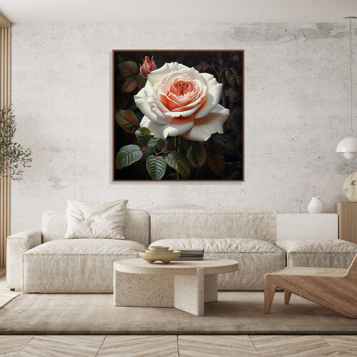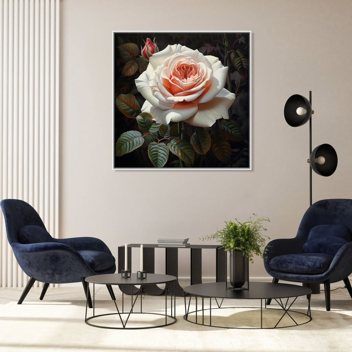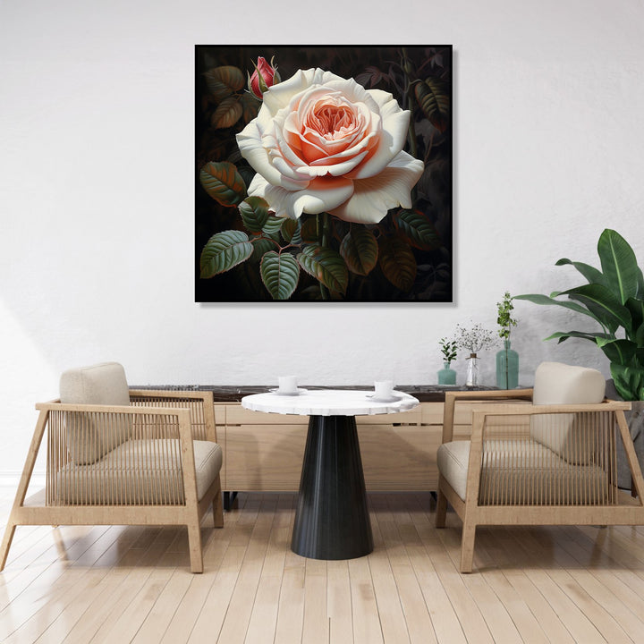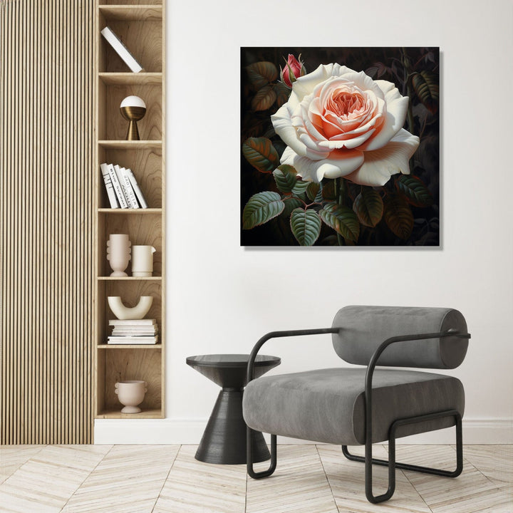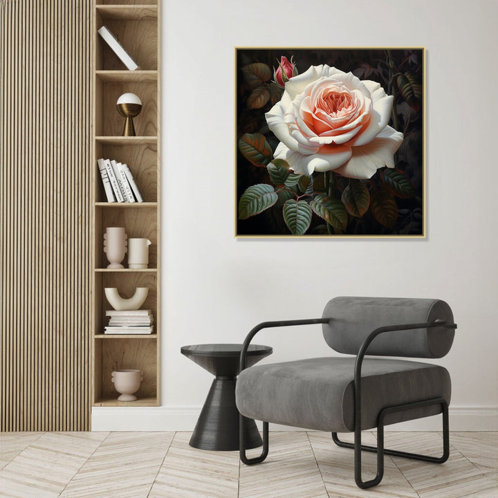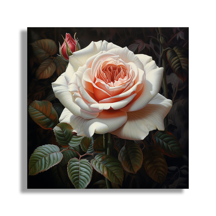 'Royal Rose' captures the essence of solitude and resilience as a single white rose stands out against a striking black background. The contrasting colours symbolise the beauty that can be found even in the darkest of times.