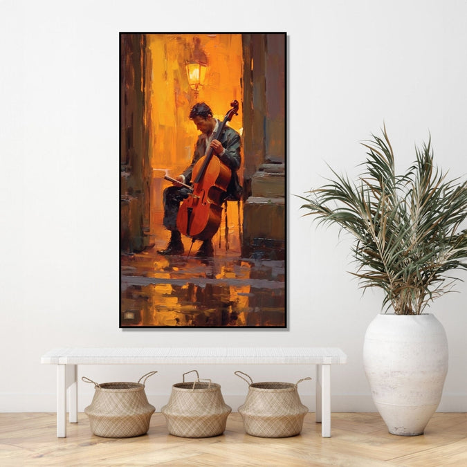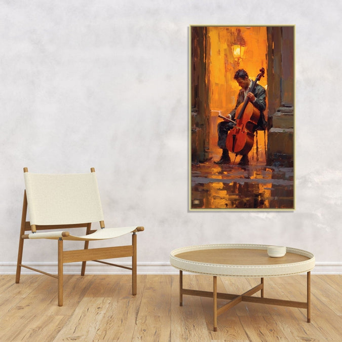 "Soul Music" depicts a white man sitting in a doorway in the street with a large violin and playing. The painting captures the soulful connection between the musician and his instrument in an urban setting.