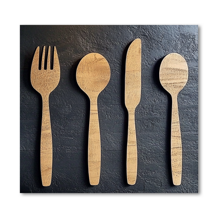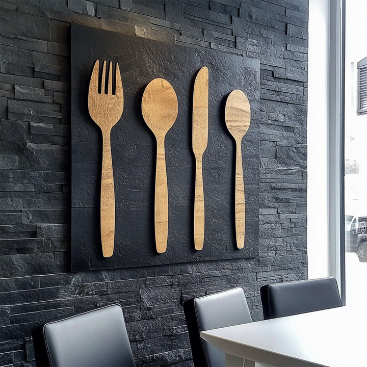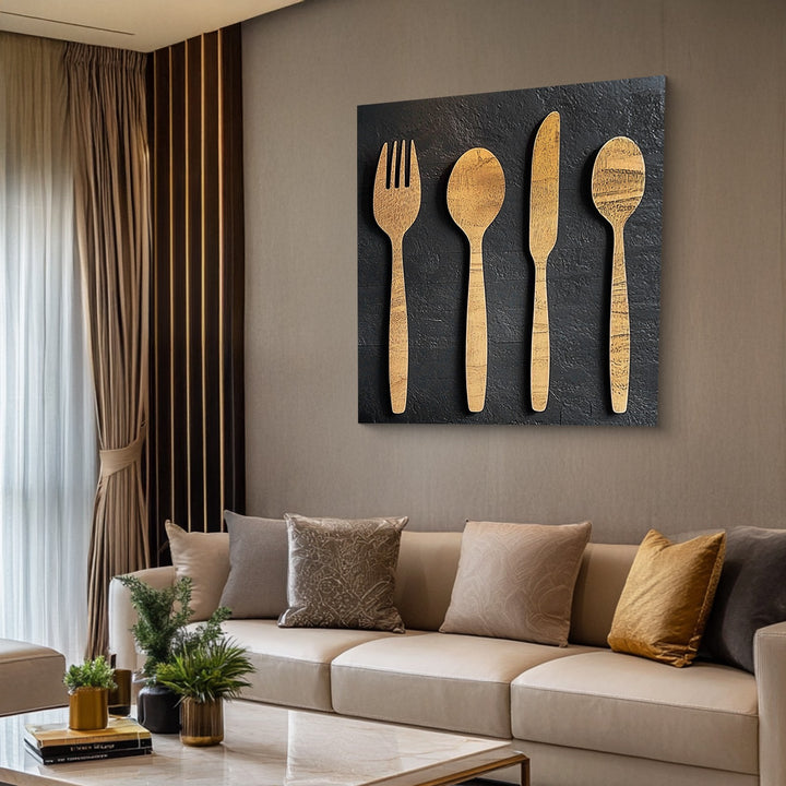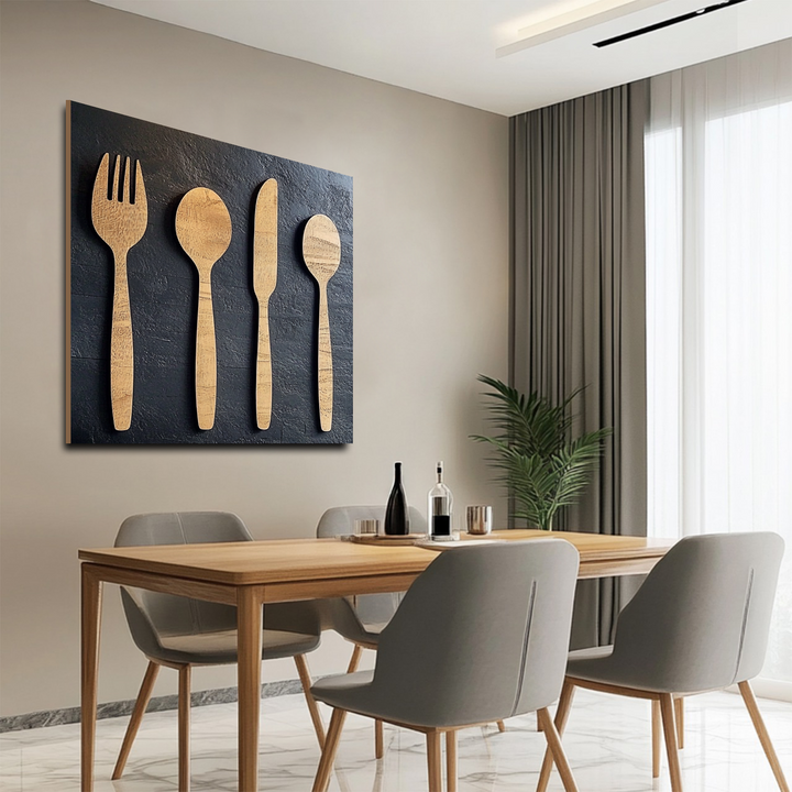 This contemporary kitchen wall art features a fork, spoon, and knife made of finely carved wood, set against a dark textured background. The contrast enhances the elegance of the minimalist yet stylish composition.