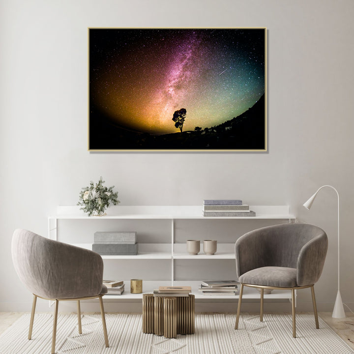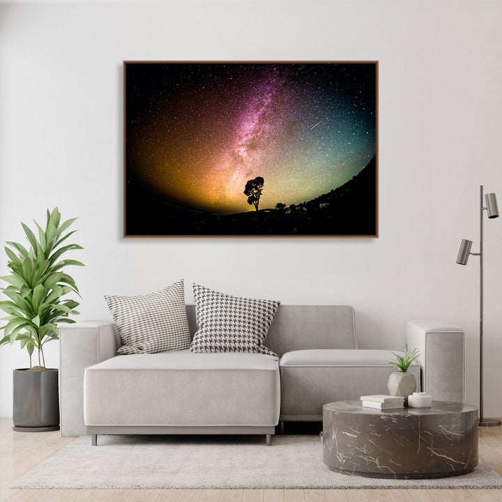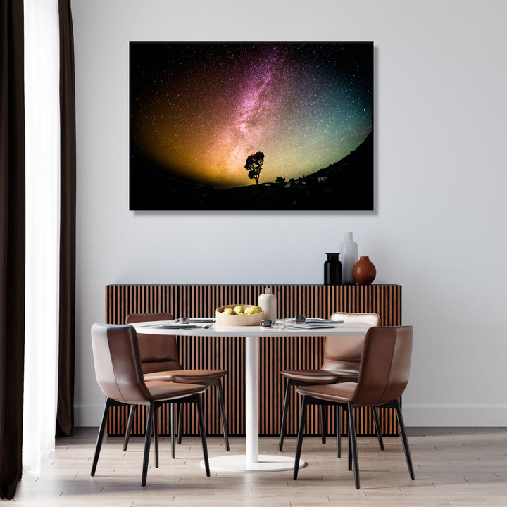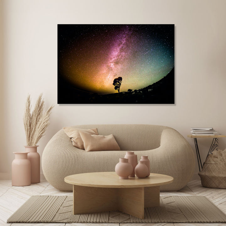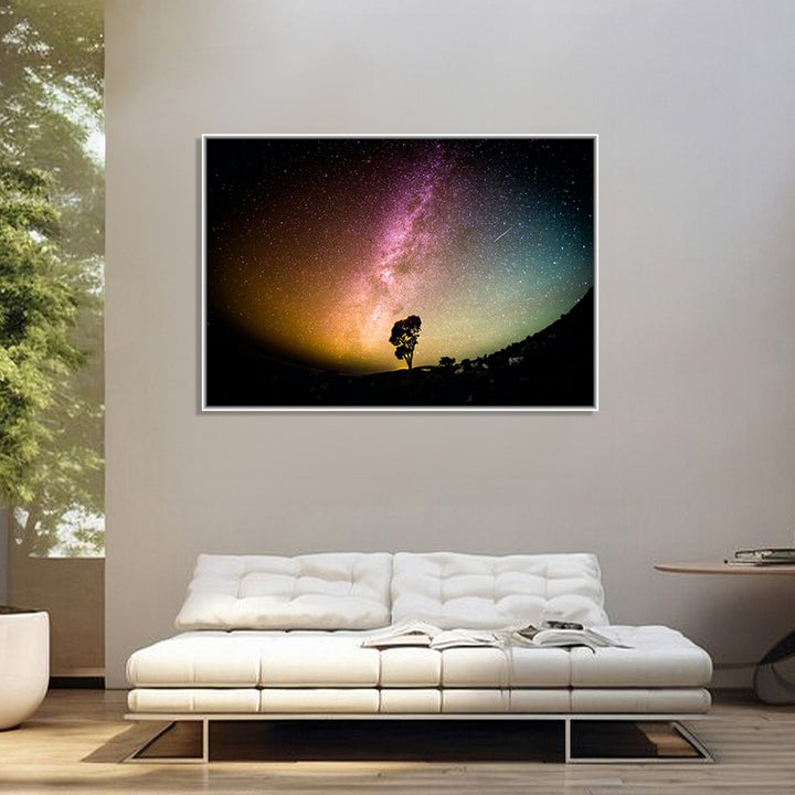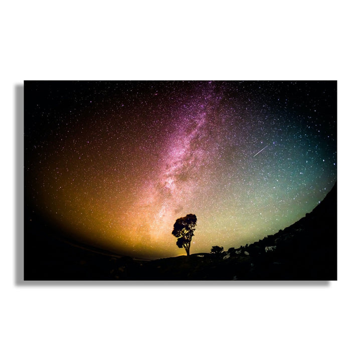 Starry Serenity' captures the tranquil beauty of a night sky adorned with the ethereal glow of the Milky Way, while a solitary tree stands tall, symbolizing strength and harmony amidst the vastness of the universe.