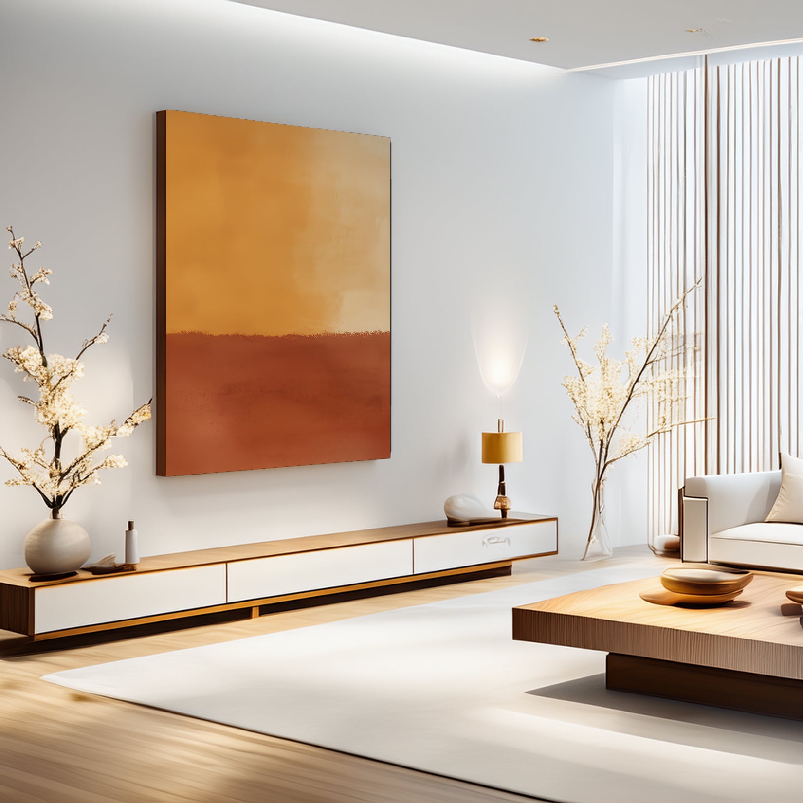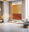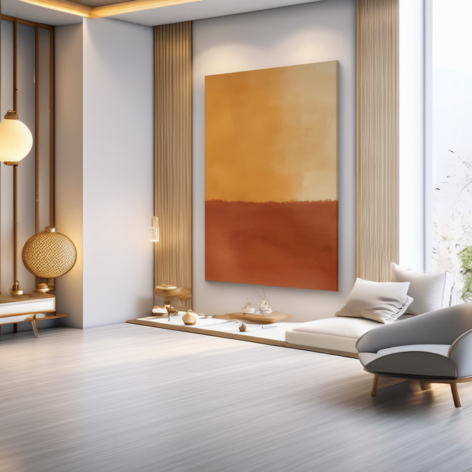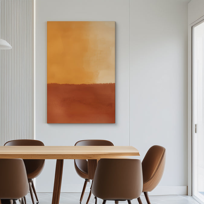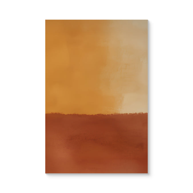 Inspired by the glow of a desert sunset, this abstract features rich golden yellows fading into burnt red with a dreamy, painterly gradient.