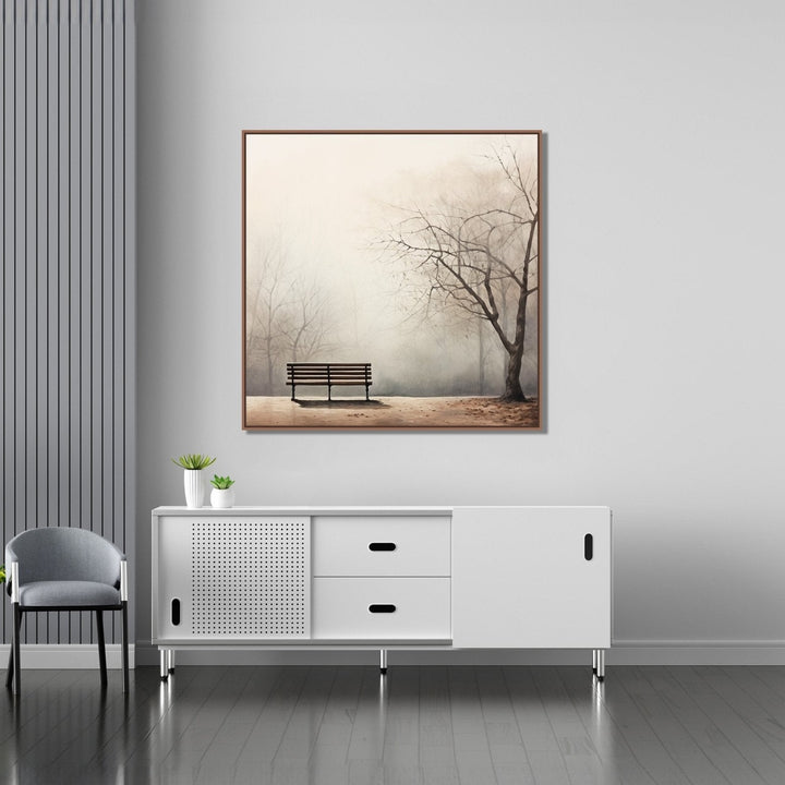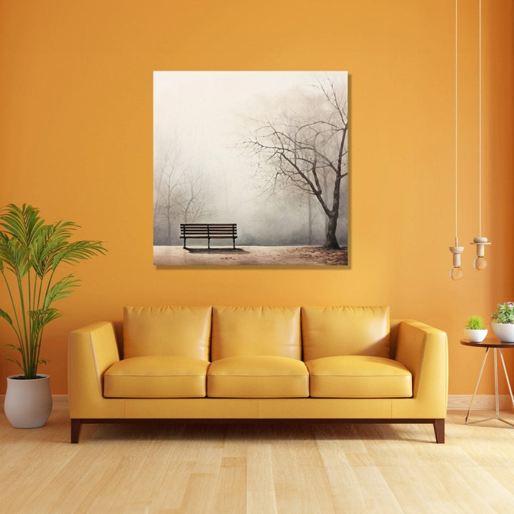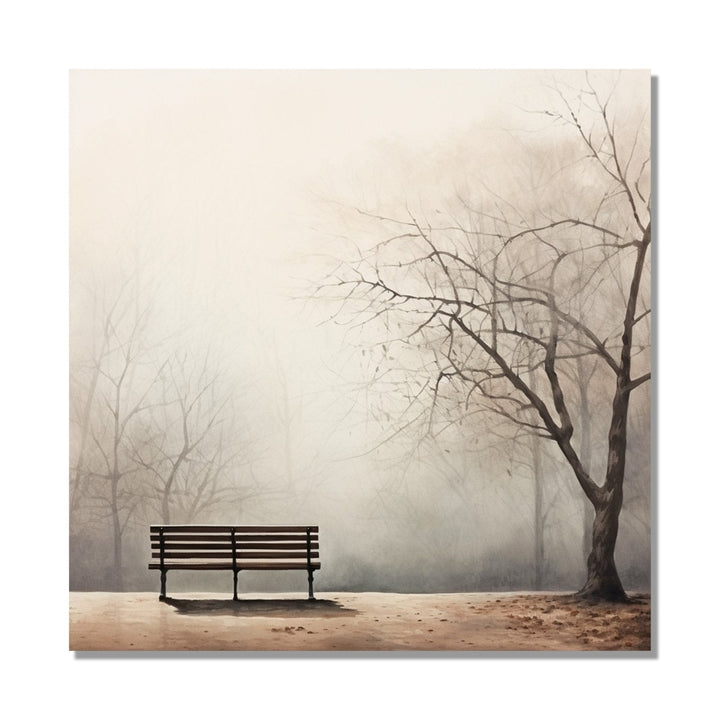 A serene winter landscape unfolds, featuring a lone bench nestled amidst trees as silent sentinels. This tranquil scene invites contemplation, capturing the essence of winter's hushed beauty.